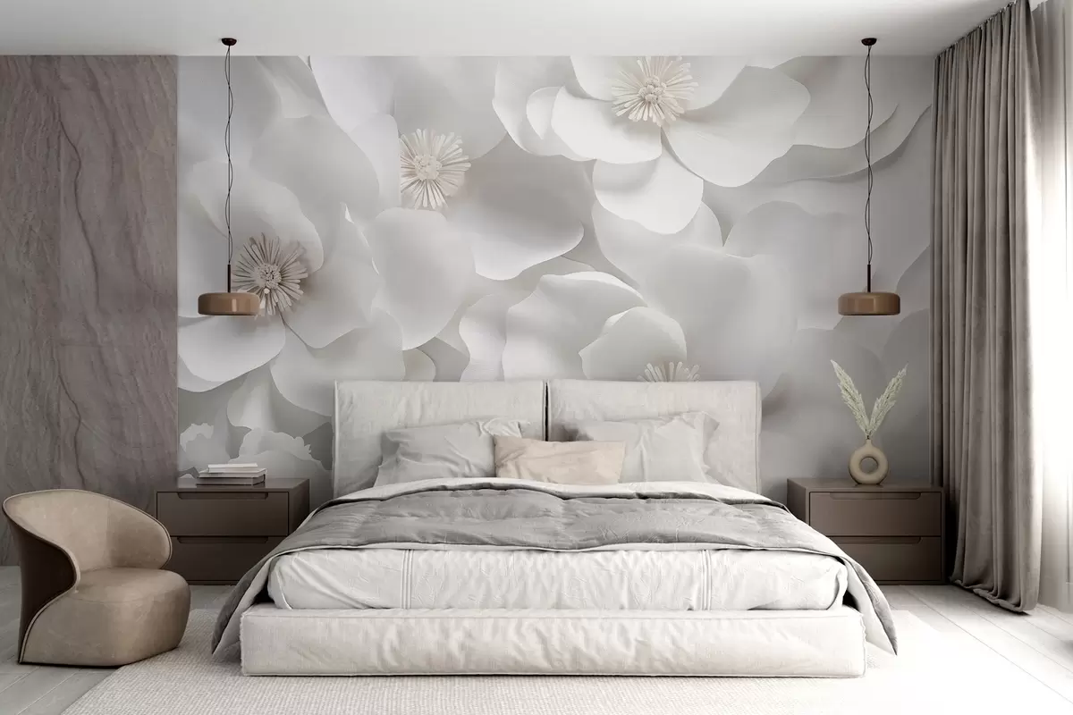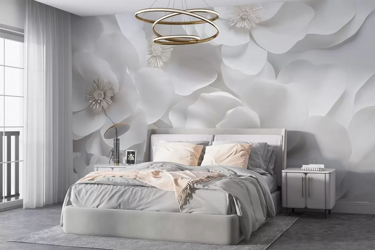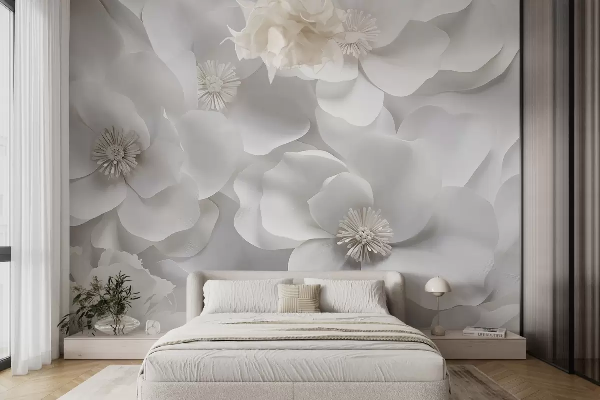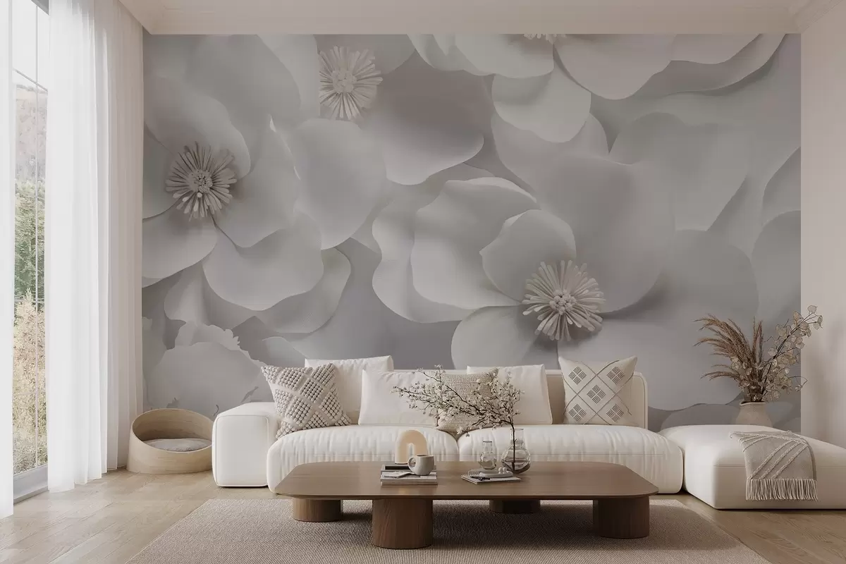 Τοιχογραφίες Λευκά λουλούδια με λεπτά πέταλα, τοποθετημένα σε ένα πυκνό σύμπλεγμα, δημιουργώντας μια αίσθηση αγνότητας και κομψότητας σε λευκό φόντο Nr. w09053