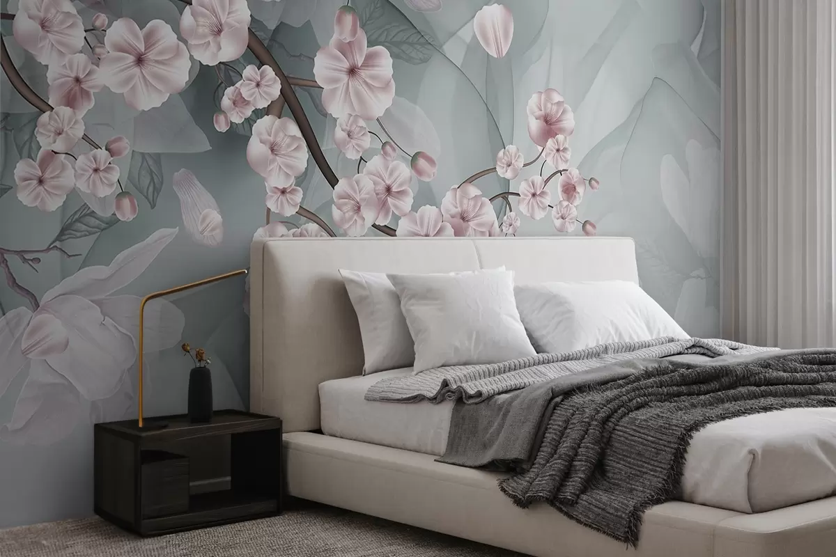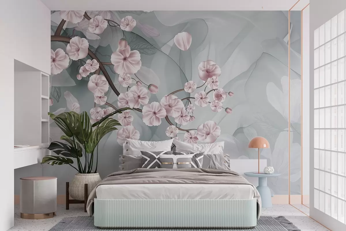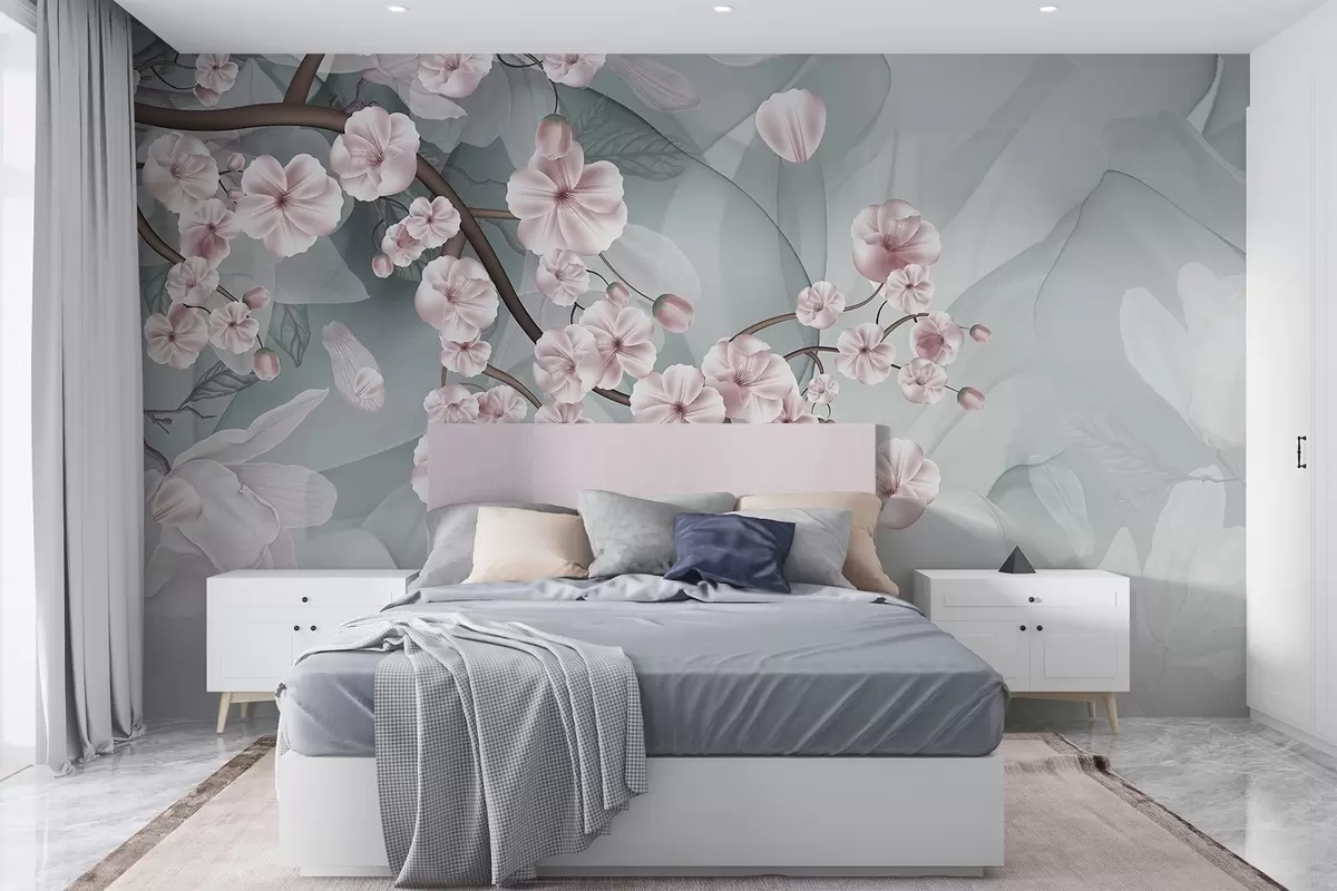 Τοιχογραφίες Κλαδιά από άνθη κερασιάς με ροζ λουλούδια και πέταλα, καφέ κλαδιά, αφηρημένο φόντο με ρέον αποτέλεσμα Nr. w09054