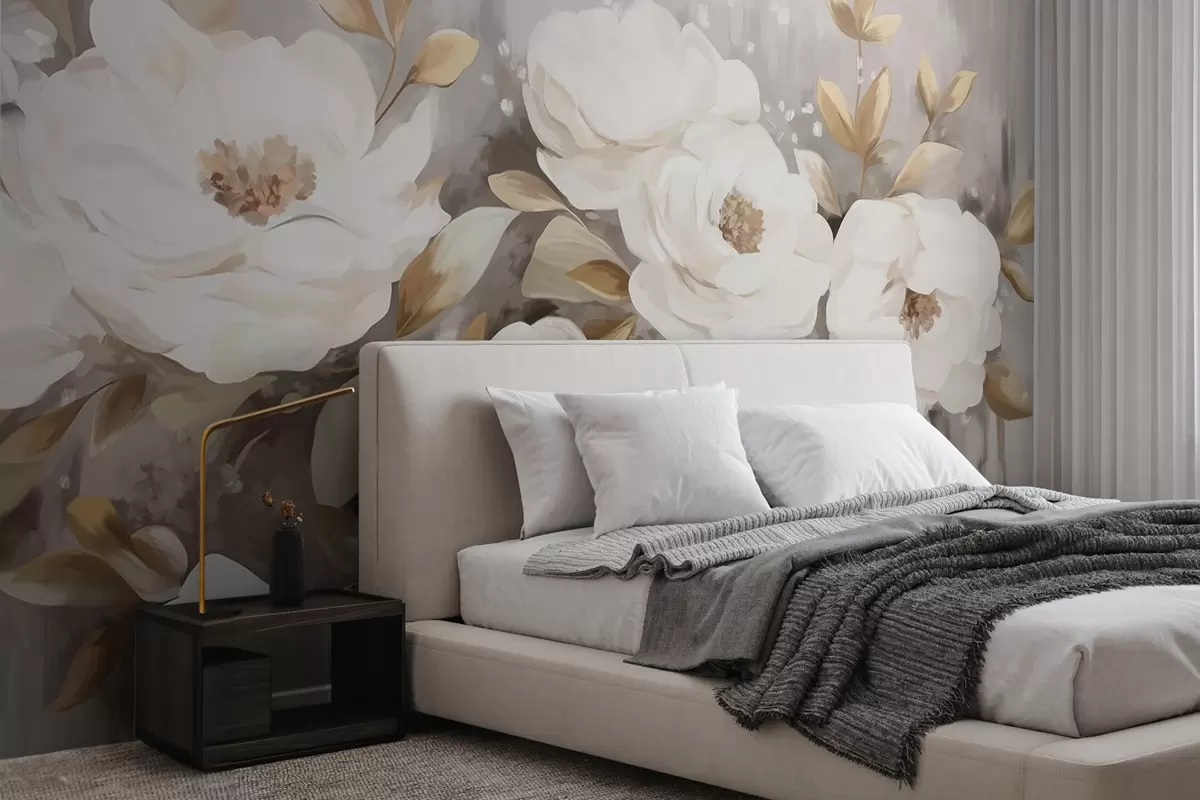 Τοιχογραφίες Λευκά λουλούδια με κίτρινα φύλλα, απαλά πέταλα, λεπτή ανθοσύνθεση, ουδέτερη παλέτα χρωμάτων, πινελιές με υφή Nr. w09062