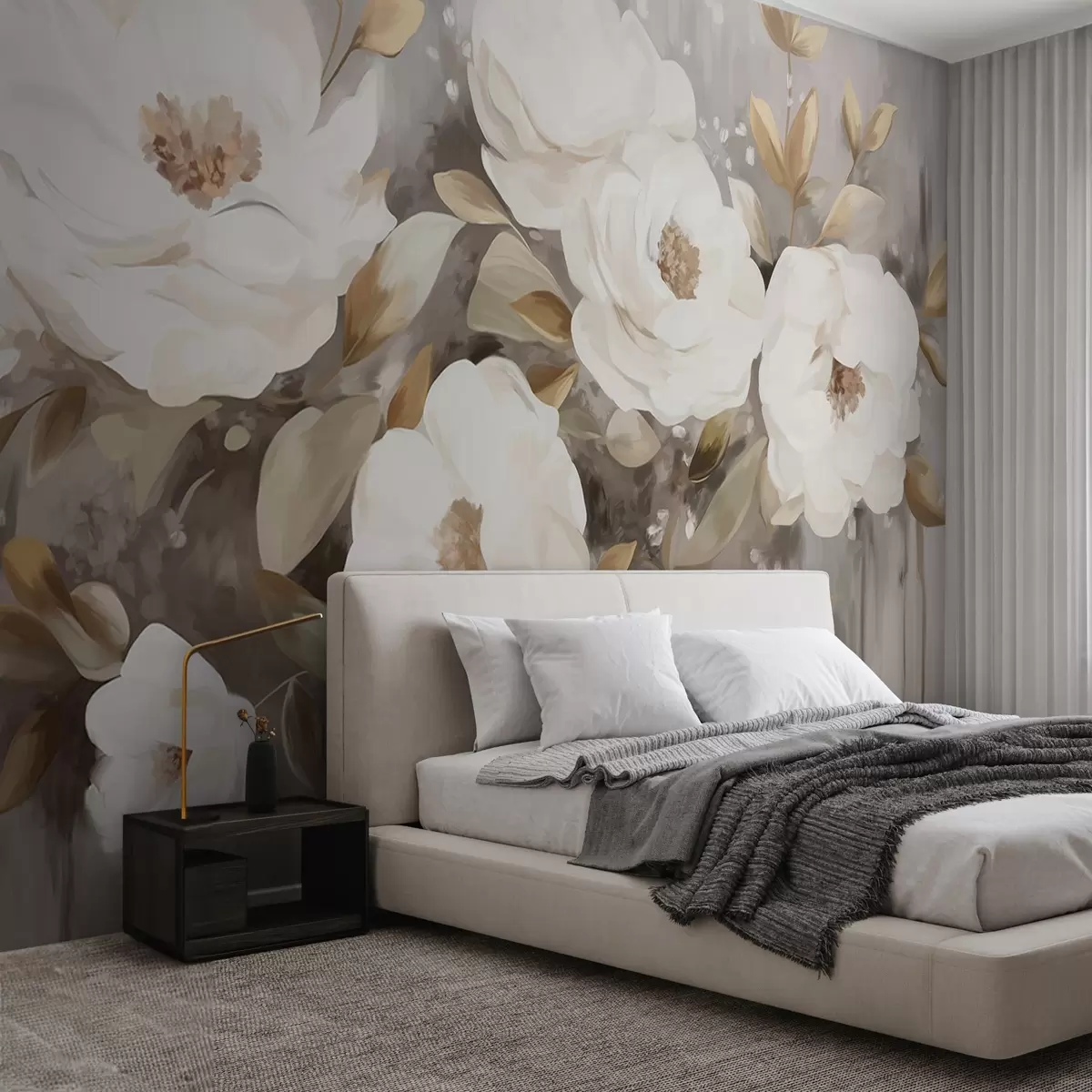 Τοιχογραφίες Λευκά λουλούδια με κίτρινα φύλλα, απαλά πέταλα, λεπτή ανθοσύνθεση, ουδέτερη παλέτα χρωμάτων, πινελιές με υφή Nr. w09062