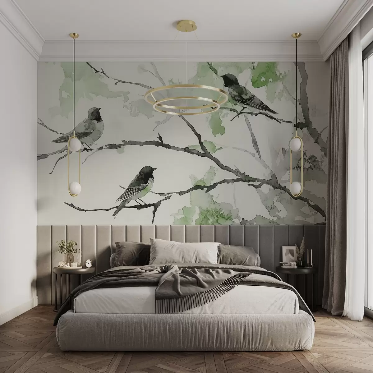 Τοιχογραφίες Πουλιά σε κλαδιά δέντρων σε στυλ ακουαρέλας Nr. w09064v3