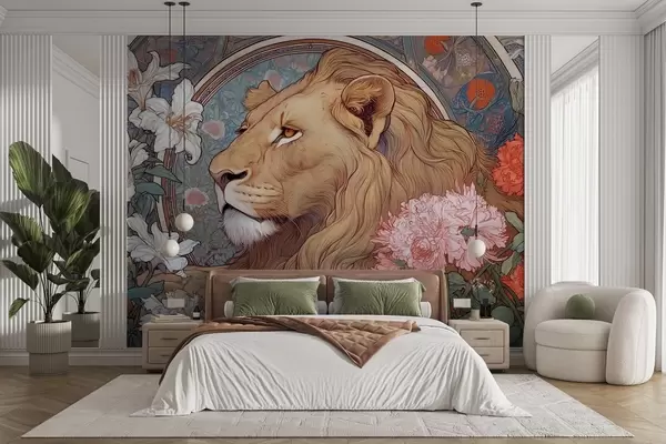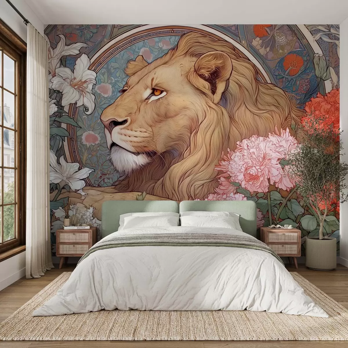 Τοιχογραφίες Ένα λιοντάρι περιτριγυρισμένο από πολλά λουλούδια στο ύφος του Alphonse Mucha Nr. w09073