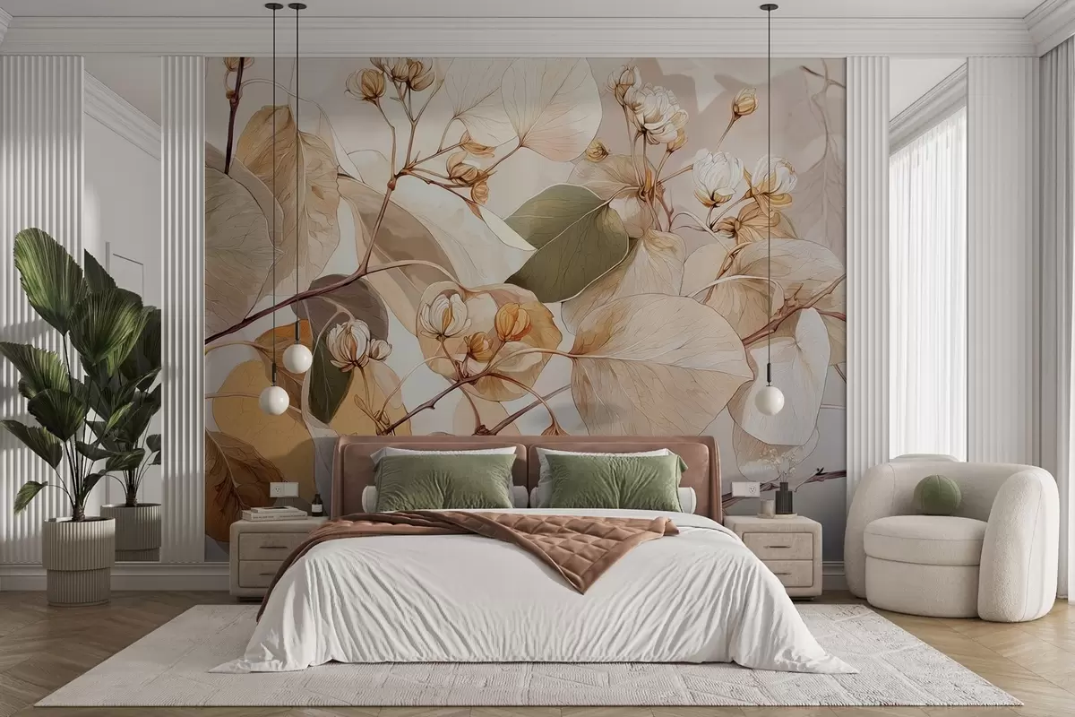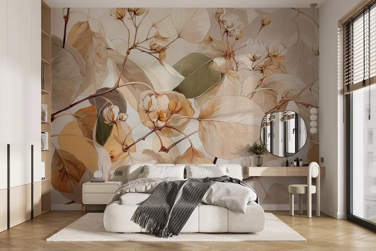 Τοιχογραφίες Κλαδιά από φύλλα λεύκας και λουλούδια σε στυλ ελαιογραφίας σε μπεζ τόνους Nr. w09082