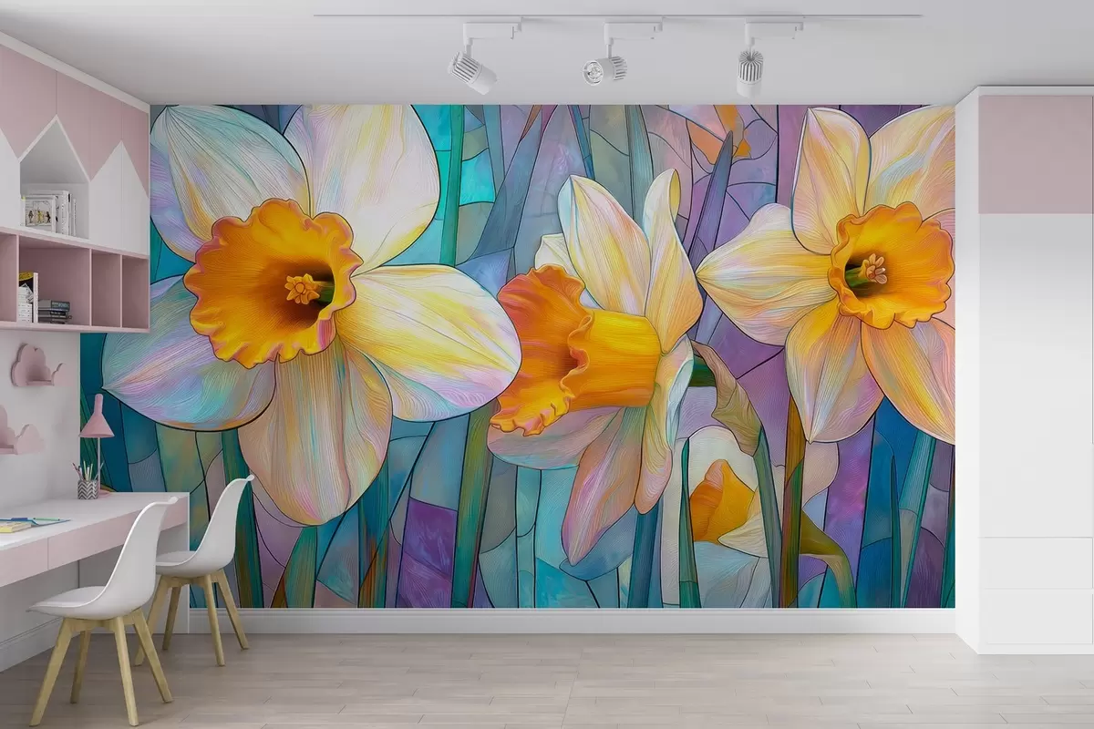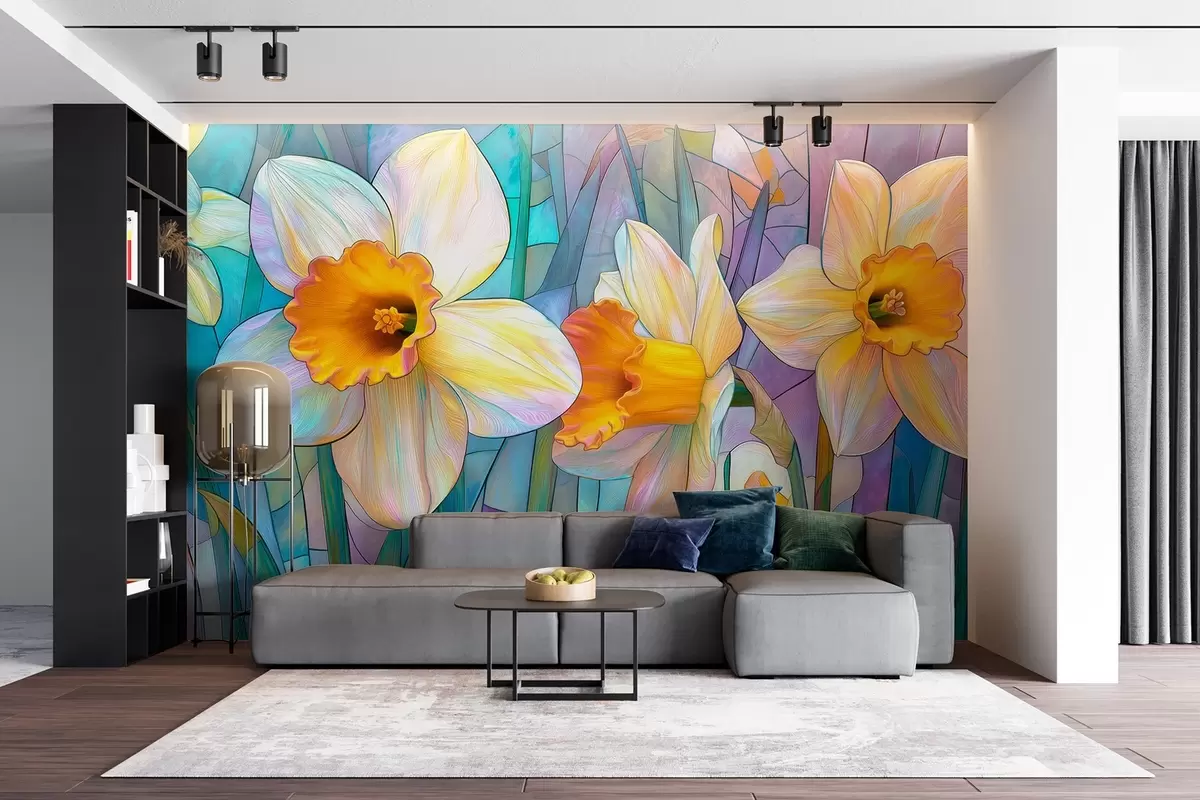 Τοιχογραφίες Πολύχρωμοι νάρκισσοι σε μπλε-βιολετί βιτρό φόντο Nr. w09092