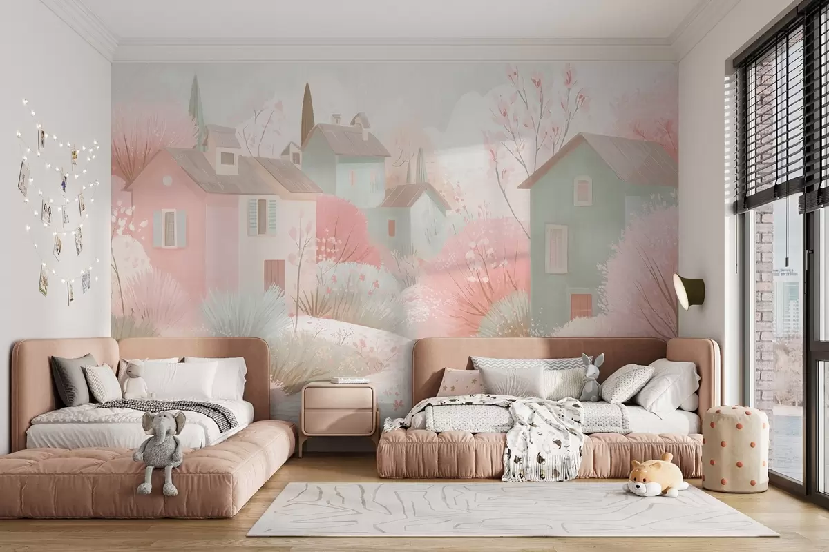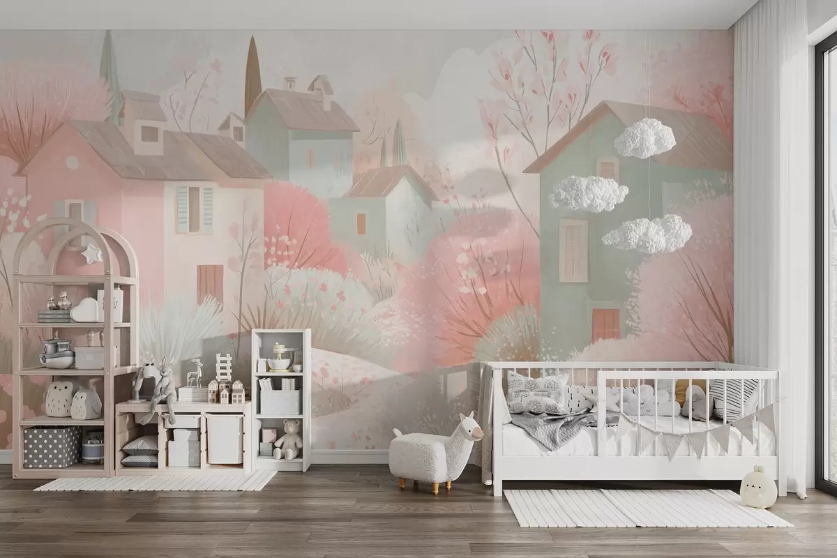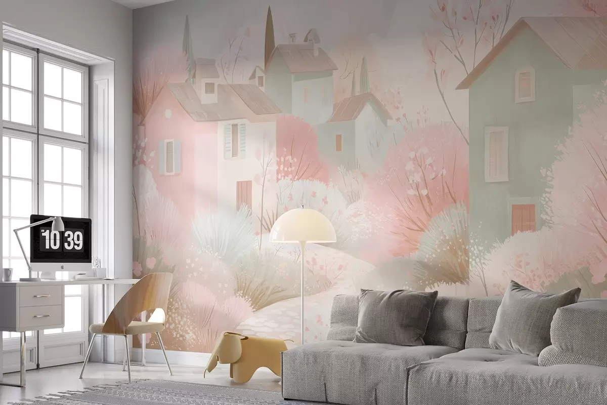 Τοιχογραφίες Παραμυθένια πόλη σε στυλ ελαιογραφίας σε ροζ αποχρώσεις Nr. w09095