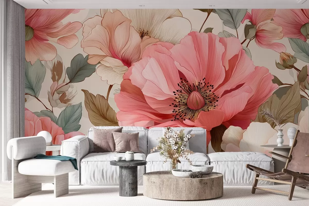 Τοιχογραφίες Ντελικάτες παπαρούνες με φύλλα σε κόκκινες-ροζ αποχρώσεις Nr. w09100