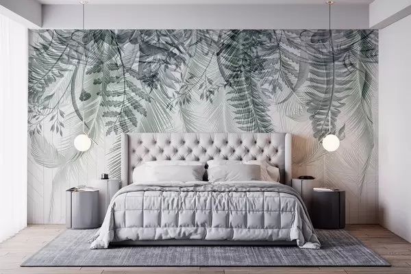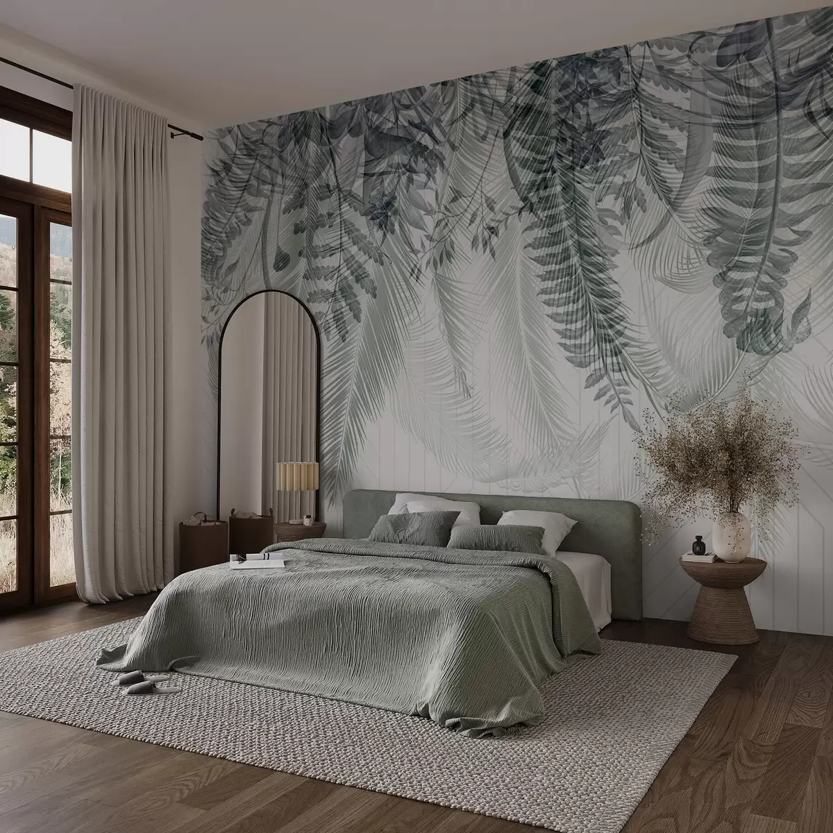 Τοιχογραφίες Λεπτή πτώση τροπικής φτέρης και φύλλα φοίνικα, γεωμετρικό φόντο, απαλό φως, απαλά χρώματα, κομψό Nr. w09106