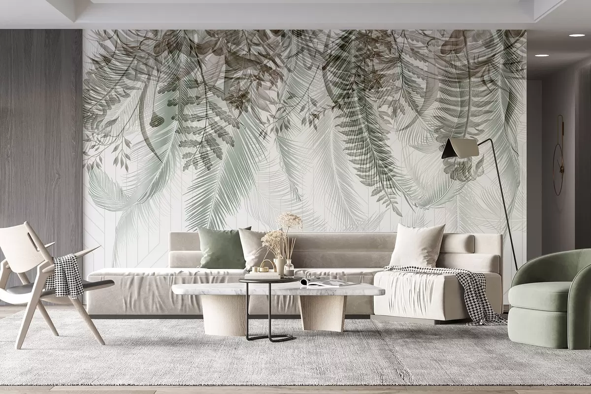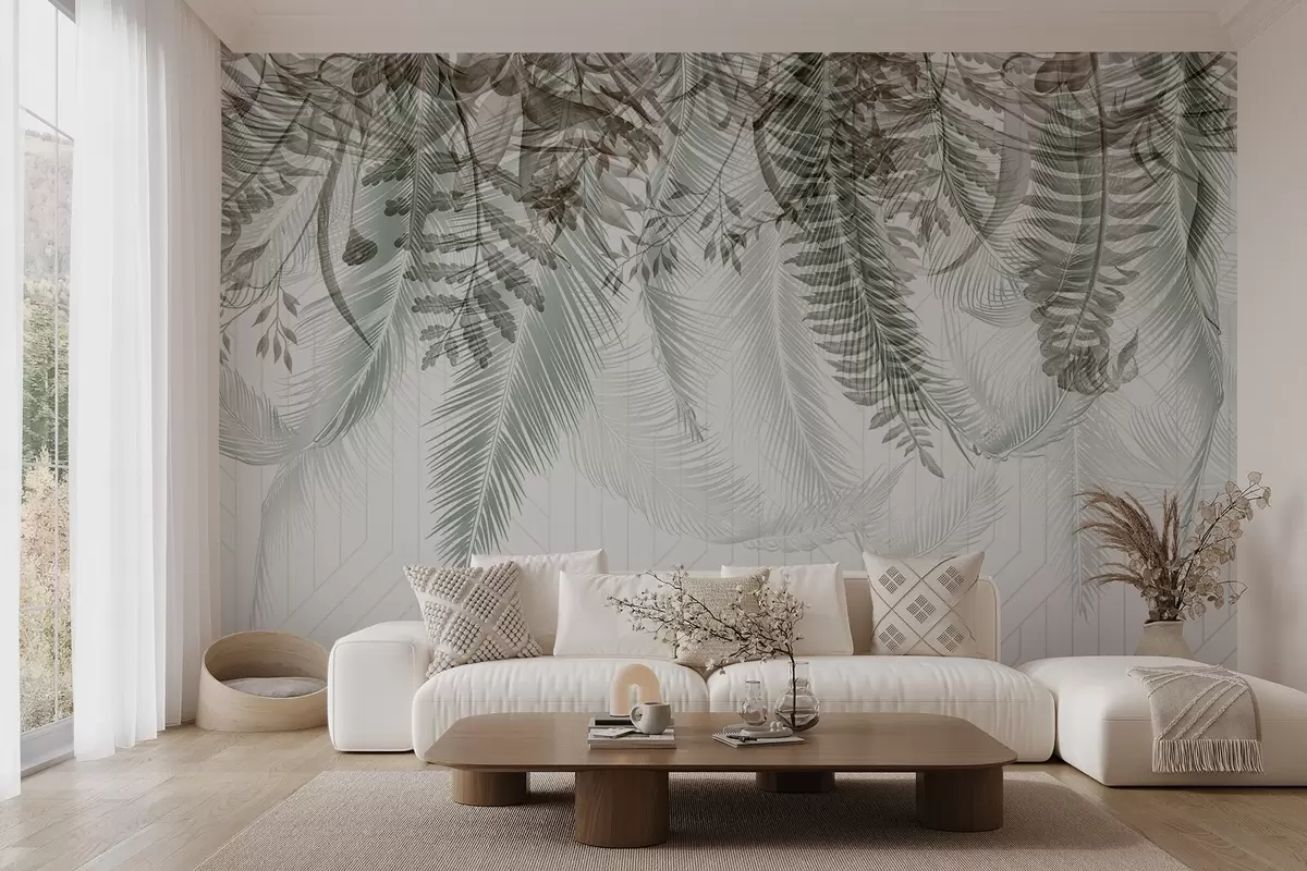 Τοιχογραφίες Λεπτή πτώση τροπικής φτέρης και φύλλα φοίνικα, γεωμετρικό φόντο, απαλό φως, απαλά χρώματα, κομψό Nr. w09106v1