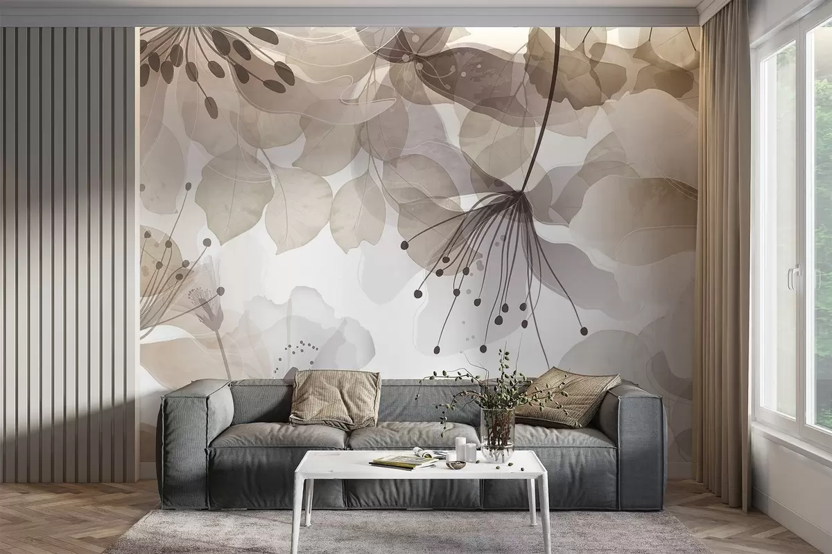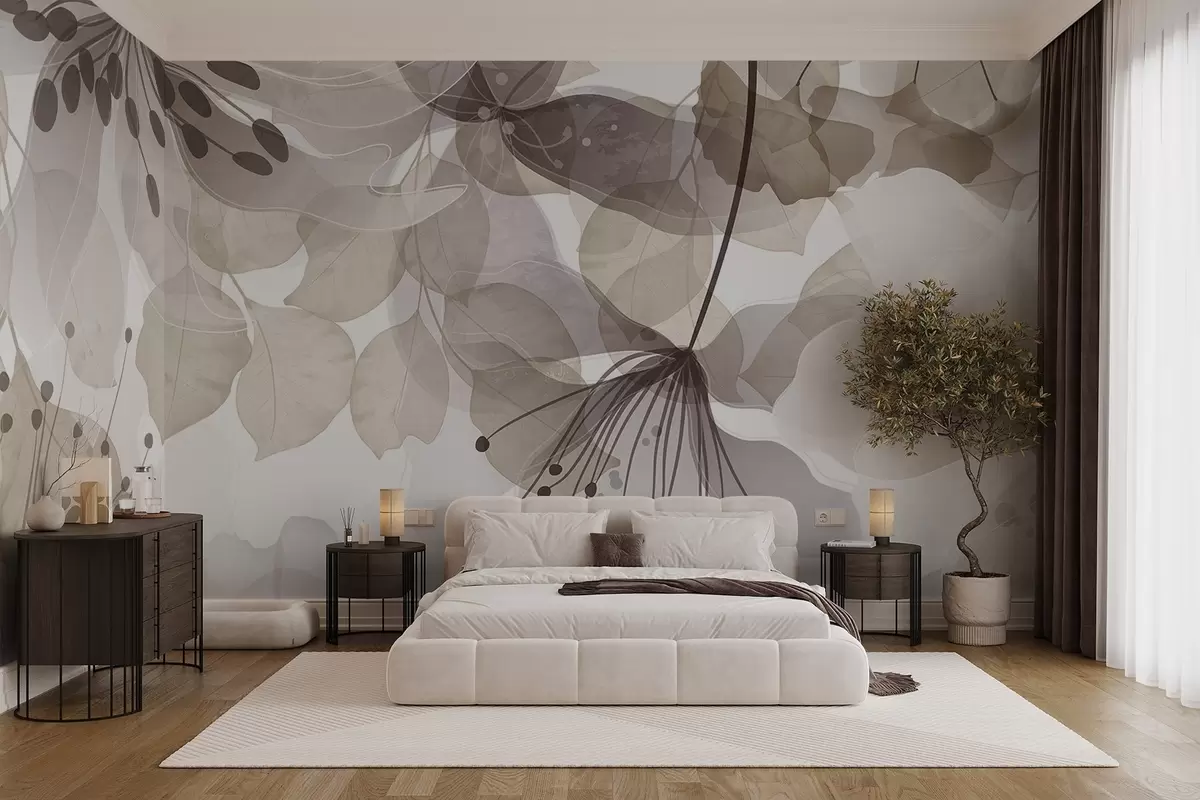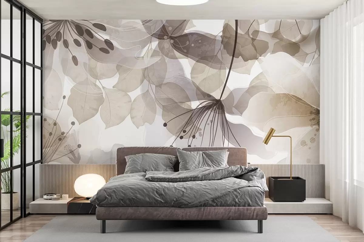 Τοιχογραφίες Λουλούδια και φύλλα σε μπεζ χρώματα, ημιδιαφανή πέταλα και φύλλα, απαλό εφέ υδατογραφίας, λεπτές γραμμές, λευκό φόντο Nr. w09107v1