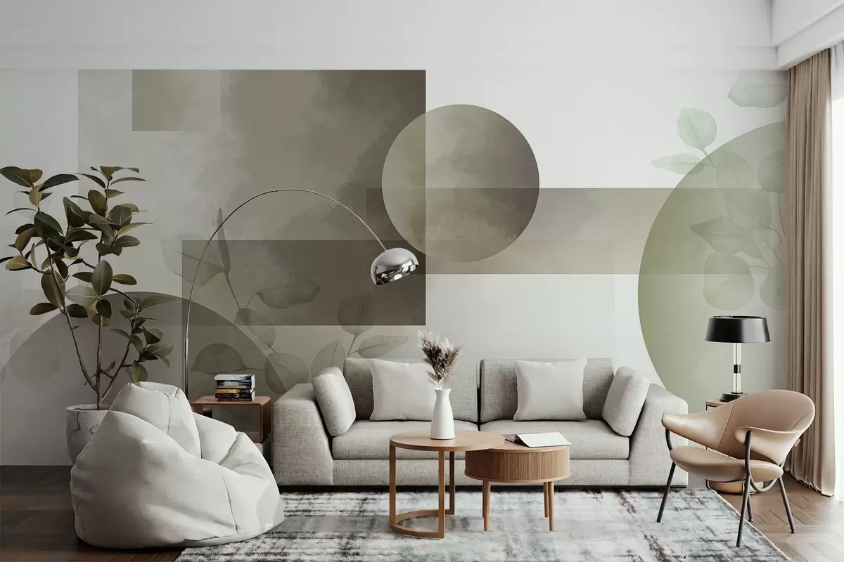 Τοιχογραφίες Αφηρημένο μοντέρνο μινιμαλιστικό γεωμετρικό σχέδιο με κύκλους και ορθογώνια, φύλλα ευκαλύπτου, εφέ ακουαρέλας Nr. w09110v1