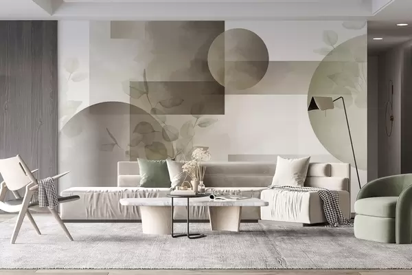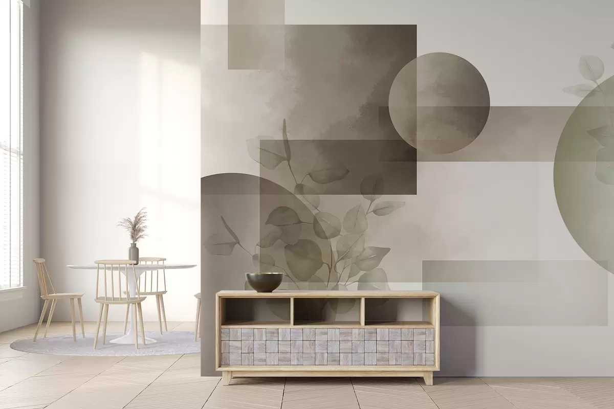 Τοιχογραφίες Αφηρημένο μοντέρνο μινιμαλιστικό γεωμετρικό σχέδιο με κύκλους και ορθογώνια, φύλλα ευκαλύπτου, εφέ ακουαρέλας Nr. w09110v1