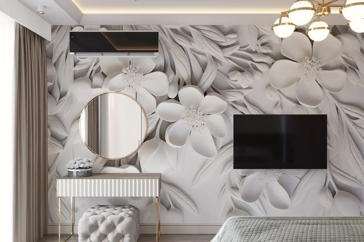 Τοιχογραφίες Λευκά λουλούδια και φύλλα σε λευκό φόντο, floral κομψό, διακοσμητικό σχέδιο, περίπλοκες λεπτομέρειες Nr. w09113
