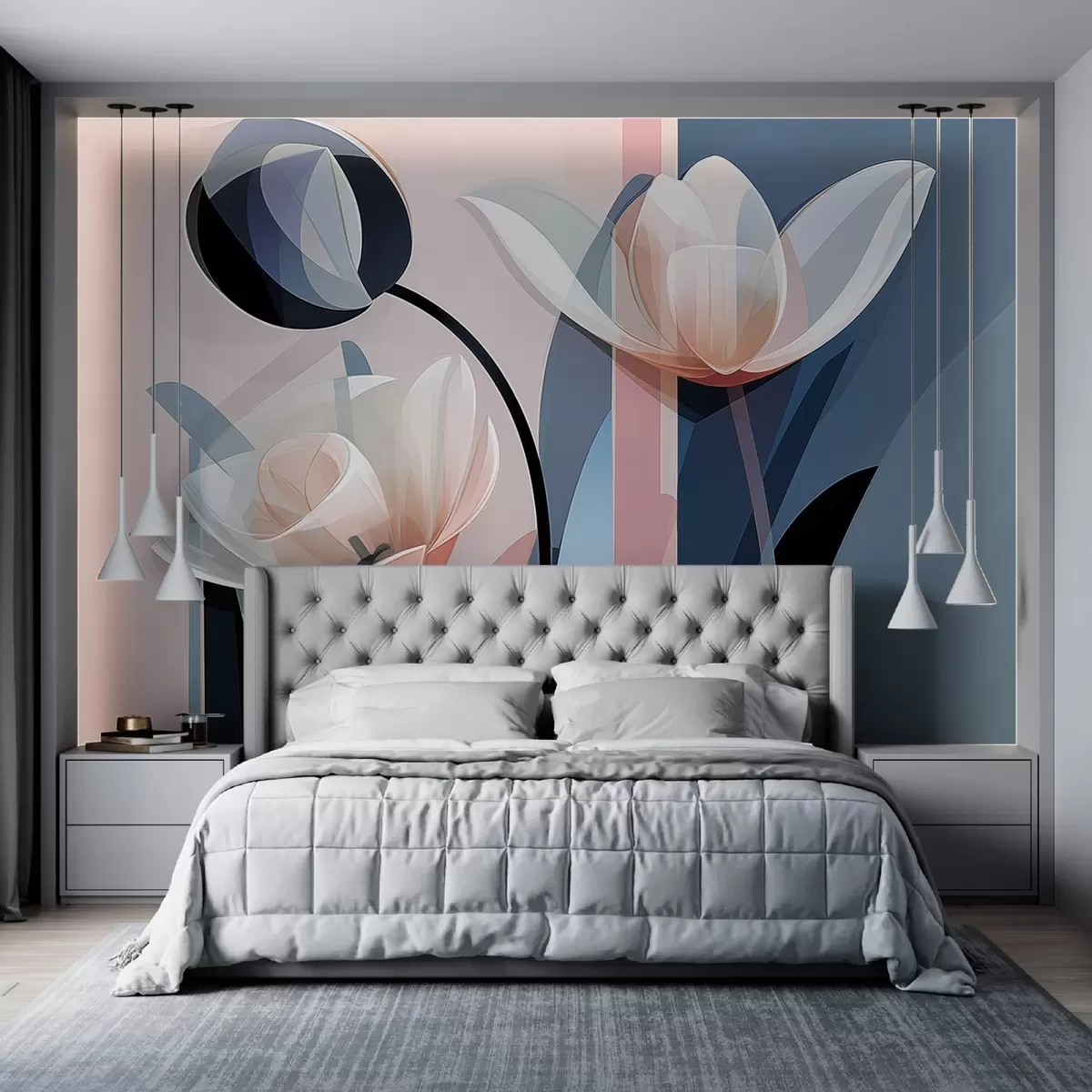 Τοιχογραφίες Αφηρημένο μοντέρνο σχέδιο με τουλίπες με διαφανή πέταλα σε παστέλ αποχρώσεις του ροζ, του λευκού και του σκούρου μπλε Nr. w09116
