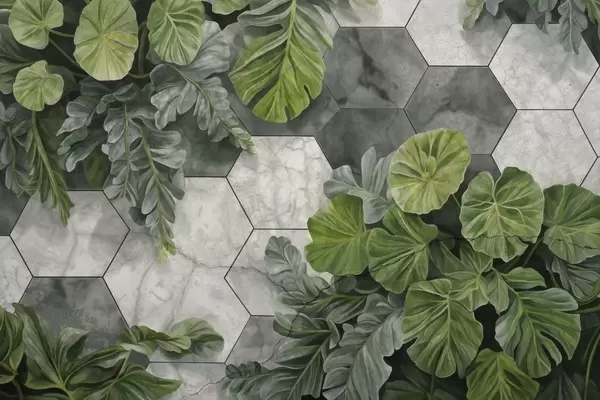 Τοιχογραφίες Πράσινα τροπικά φύλλα και φυτά σε φόντο από γκρι και λευκά κεραμίδια με υφή, πλούσιο φύλλωμα μοντέρνο σχεδιασμό Nr. w09117
