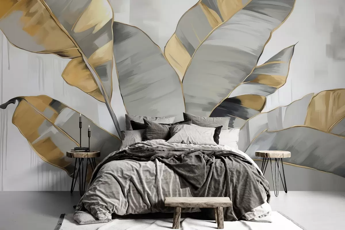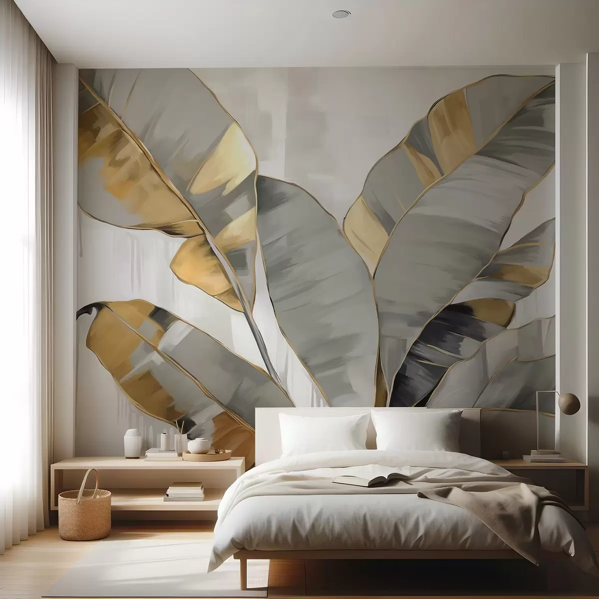 Τοιχογραφίες Μπανάνα τροπικά φύλλα με υφή με γκρι και κίτρινους τόνους, μοντέρνο στυλ, ουδέτερο φόντο, διακοσμητική ζωγραφική Nr. w09118