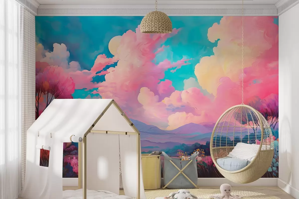 Τοιχογραφίες Πολύχρωμο τοπίο σε στυλ ελαιογραφίας με ροζ ουρανό, φυτά και δέντρα Nr. w09123
