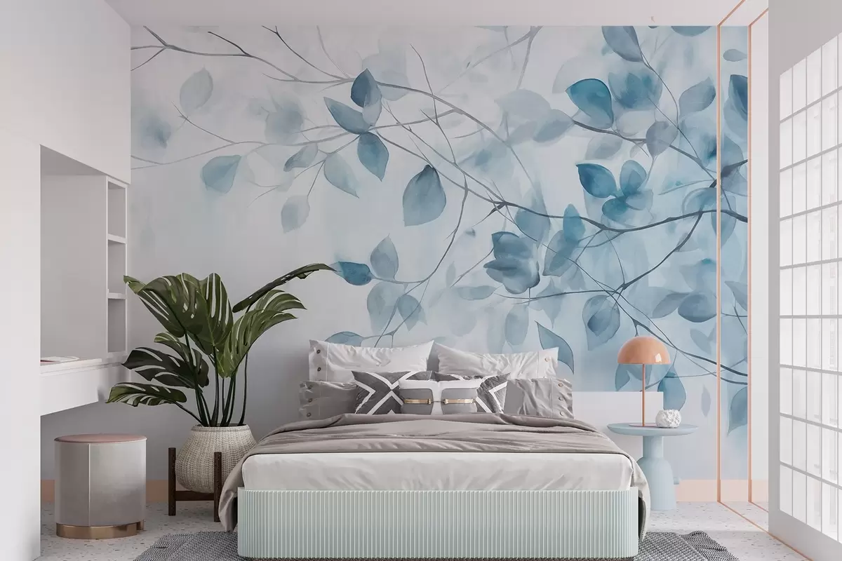 Τοιχογραφίες Υφή ακουαρέλας απομίμηση μπλε φύλλων και κλαδιών, απαλά χρώματα, λεπτές λεπτομέρειες σε λευκό φόντο Nr. w09133v1