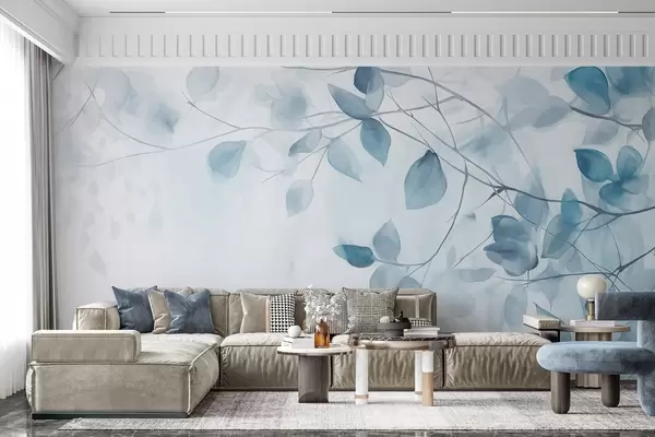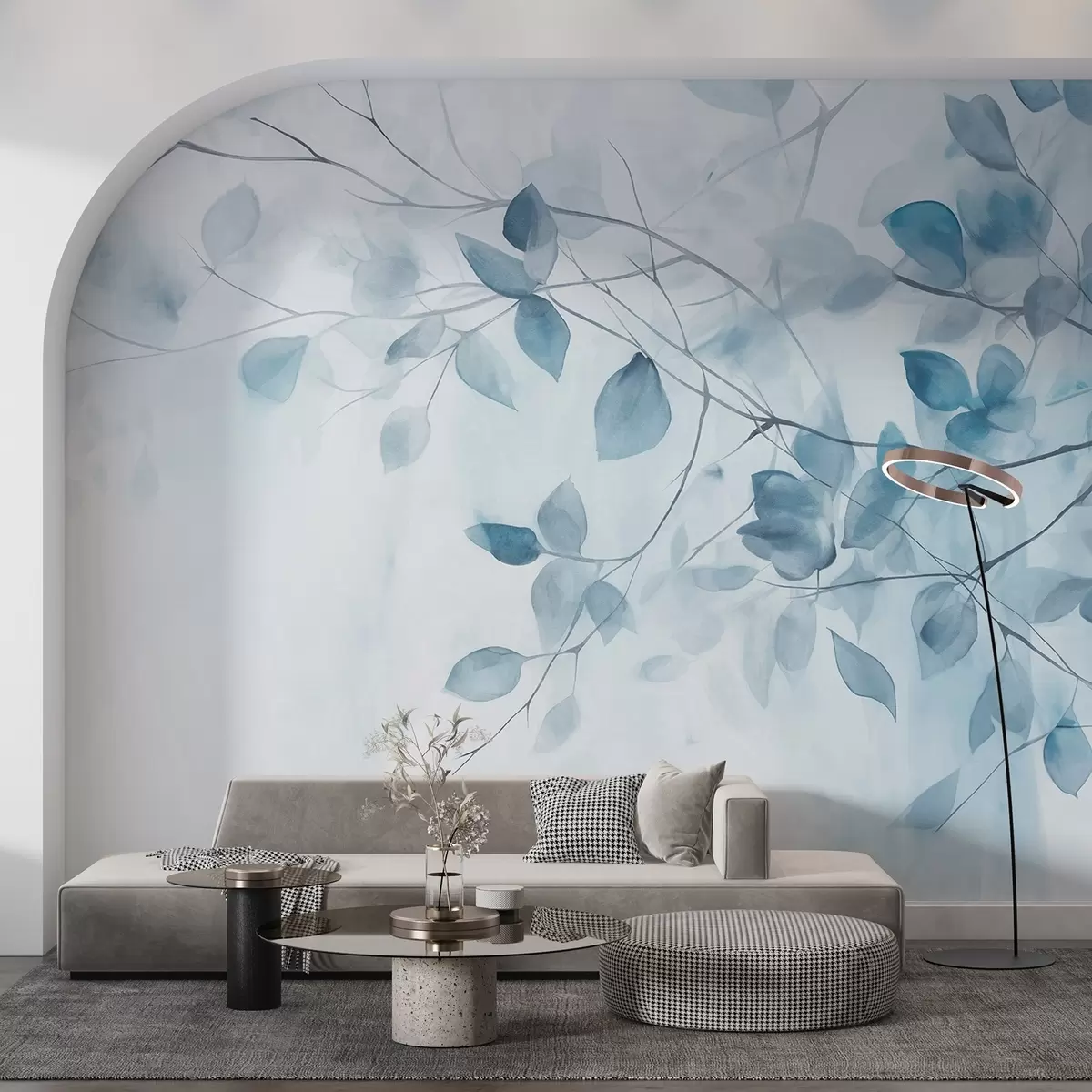 Τοιχογραφίες Υφή ακουαρέλας απομίμηση μπλε φύλλων και κλαδιών, απαλά χρώματα, λεπτές λεπτομέρειες σε λευκό φόντο Nr. w09133v1