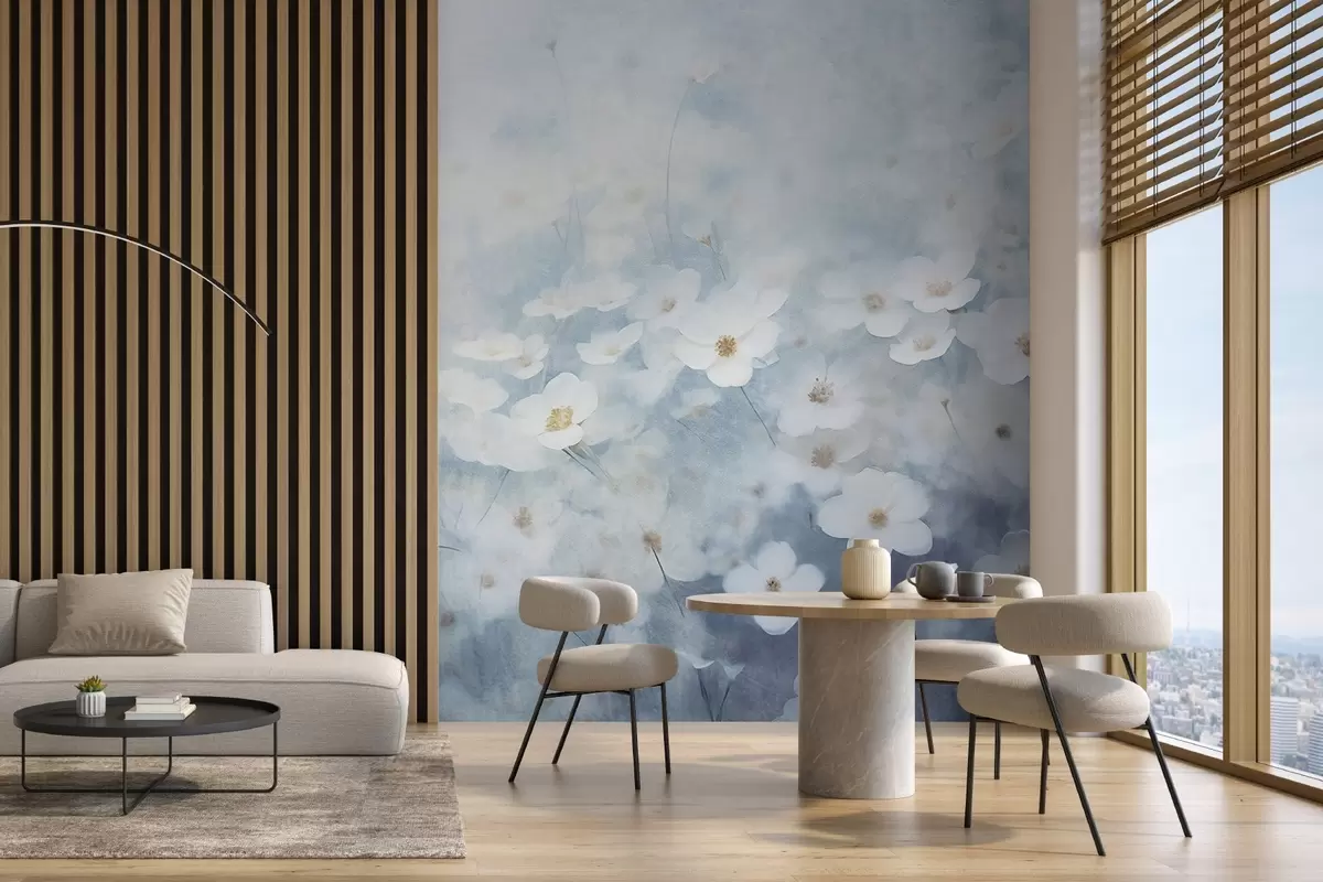 Τοιχογραφίες Πεδίο υφής με λευκά λουλούδια ανεμώνης, απαλή εστίαση, ονειρική ατμόσφαιρα, γαλάζια και λευκή παλέτα χρωμάτων, ανοιξιάτικο λιβάδι Nr. w09134