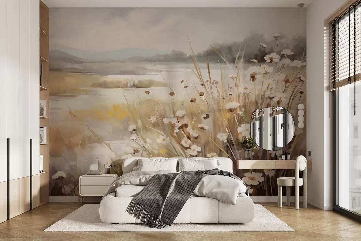 Τοιχογραφίες Πεδίο με ψηλό γρασίδι και λευκές μαργαρίτες, δέντρα στο βάθος, κάτω από συννεφιασμένο ουρανό, τοπίο με υφή, απαλές πινελιές Nr. w09139