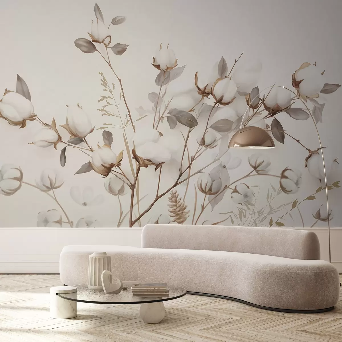τοιχογραφίες Λουλούδια από βαμβάκι με μίσχους και φύλλα σε ανοιχτό καφέ χρώμα, μπεζ φόντο, απαλό και ντελικάτο, στυλ ακουαρέλας w09141