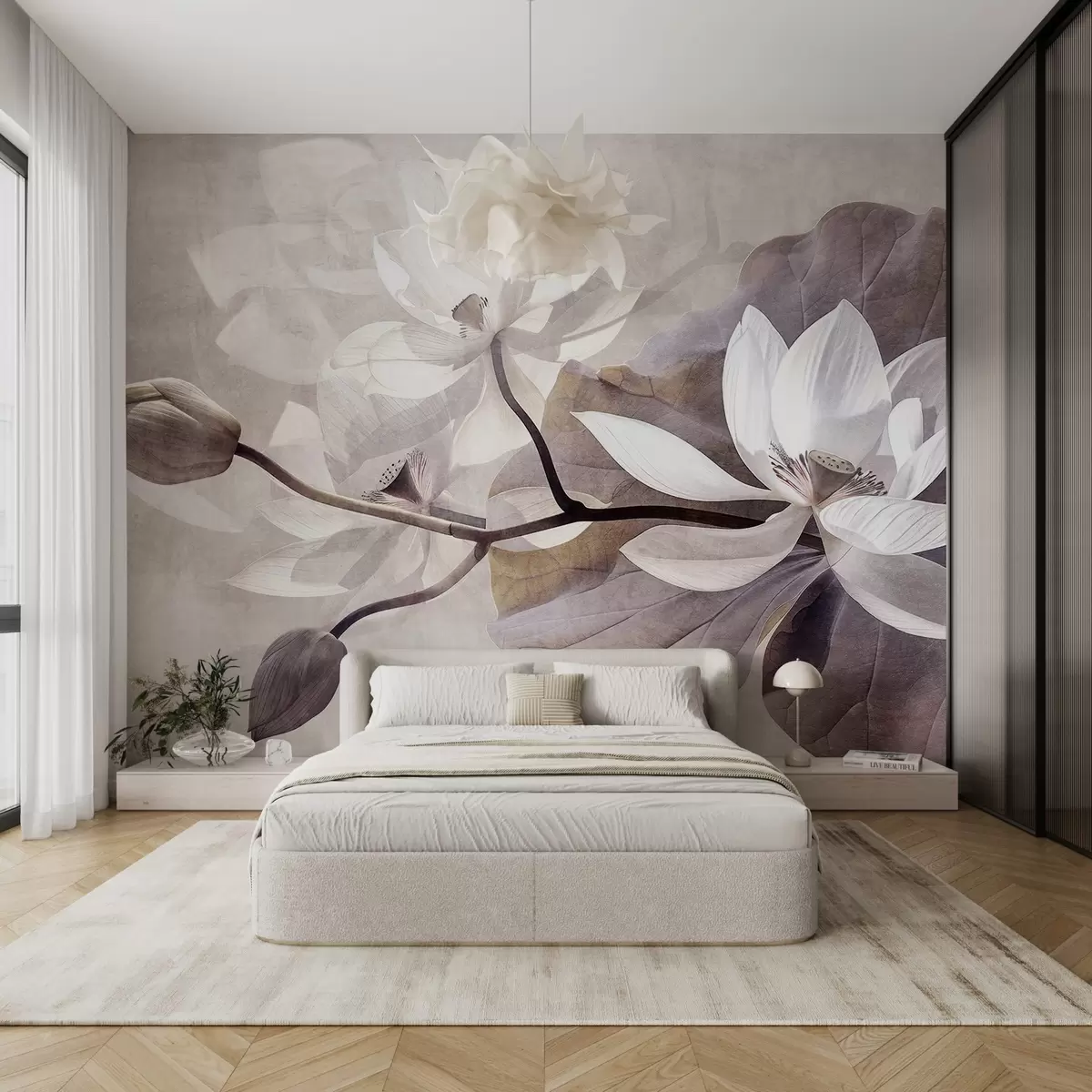 Τοιχογραφίες Κοκκώδης υφή με σιγανά λεπτά λουλούδια λωτού με φύλλα και μίσχους σε απαλή, μπεζ χρωματική παλέτα Nr. w09159