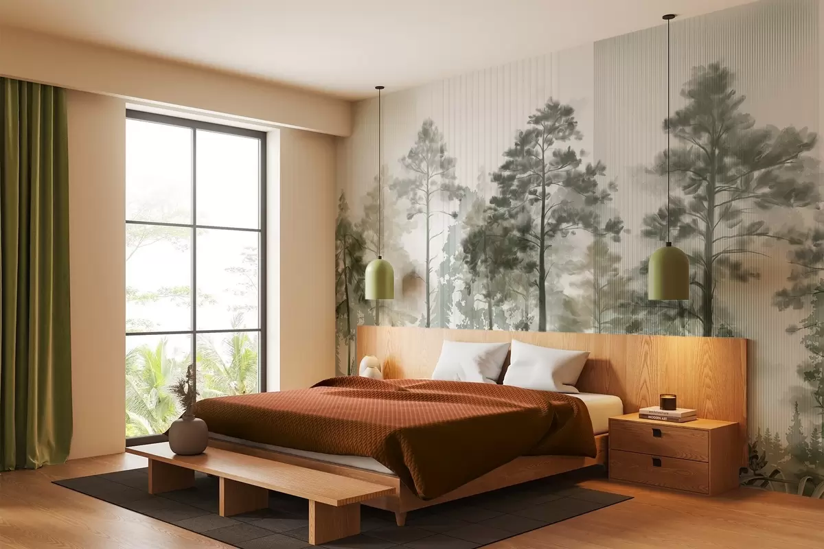 Τοιχογραφίες Ένα πυκνό δάσος με ψηλά πεύκα, πλούσιο πράσινο φύλλωμα, μια ομιχλώδη ατμόσφαιρα με κάθετες γραμμές υφές Nr. w09163