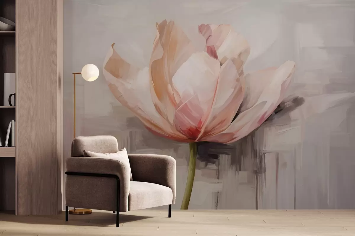 Τοιχογραφίες Ροζ τουλίπα, απομίμηση ελαιογραφίας με απαλές πινελιές, αφηρημένο φόντο με παστέλ αποχρώσεις του γκρι και του μπεζ Nr. w09187