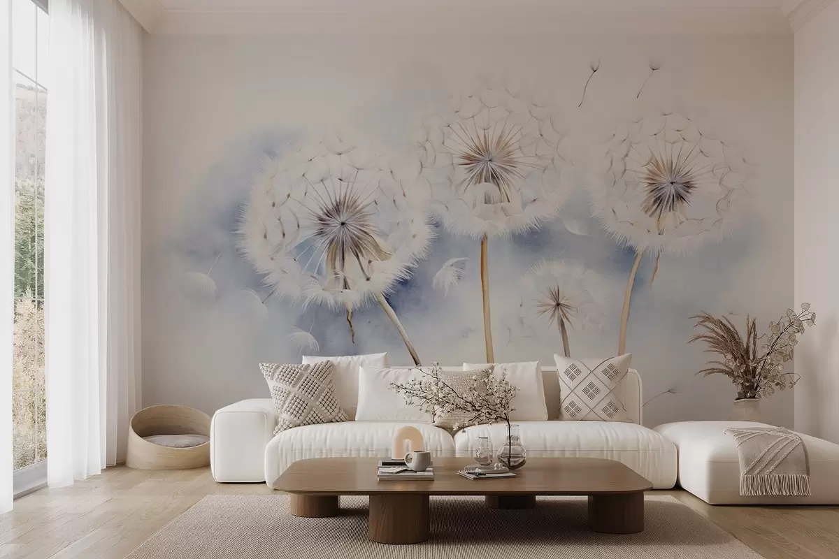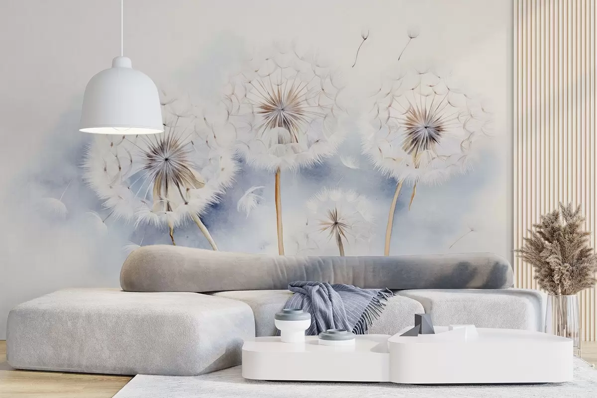 Τοιχογραφίες Πικραλίδες με υφή και σπόρους που αιωρούνται στον αέρα, γαλάζιο και λευκό φόντο, απαλό και λεπτό στυλ σχεδίασης Nr. w09190