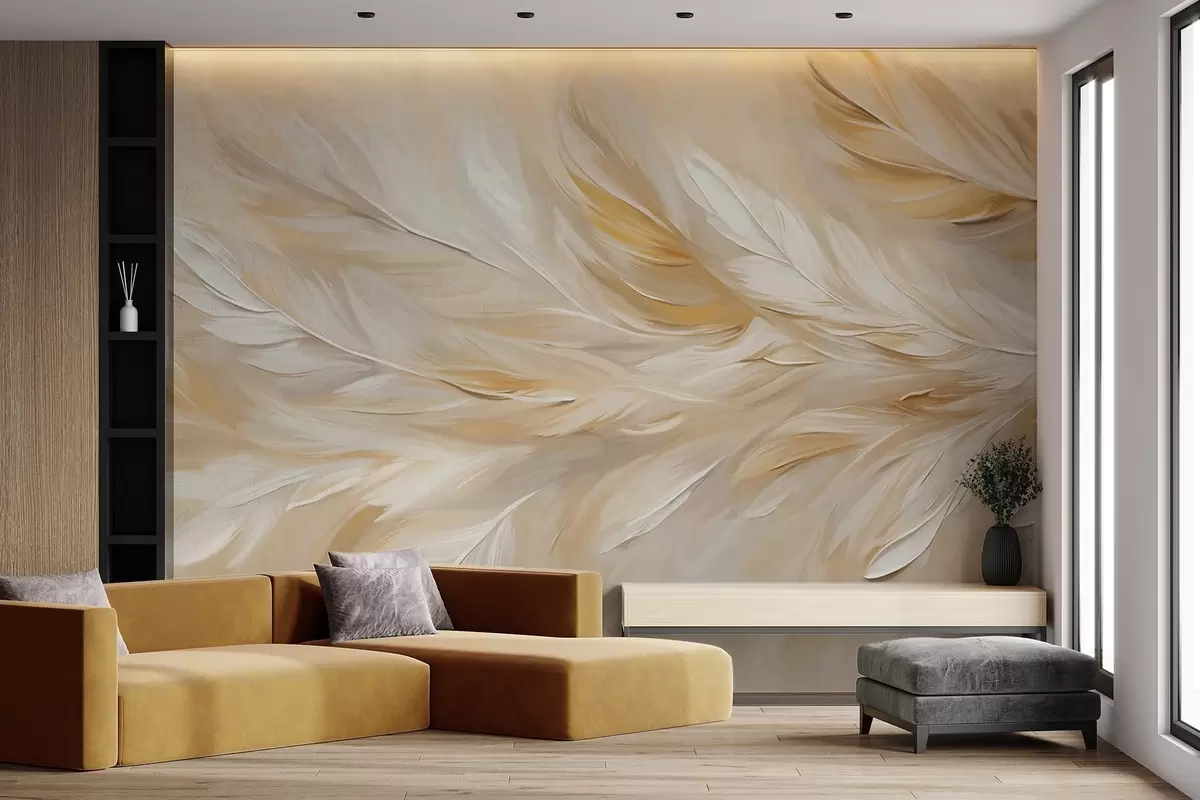 Τοιχογραφίες Λευκά και μπεζ φτερά τοποθετημένα σε μια ρέουσα εκτύπωση, απαλή υφή, ζεστή παλέτα χρωμάτων, αφηρημένο φόντο Nr. w09191
