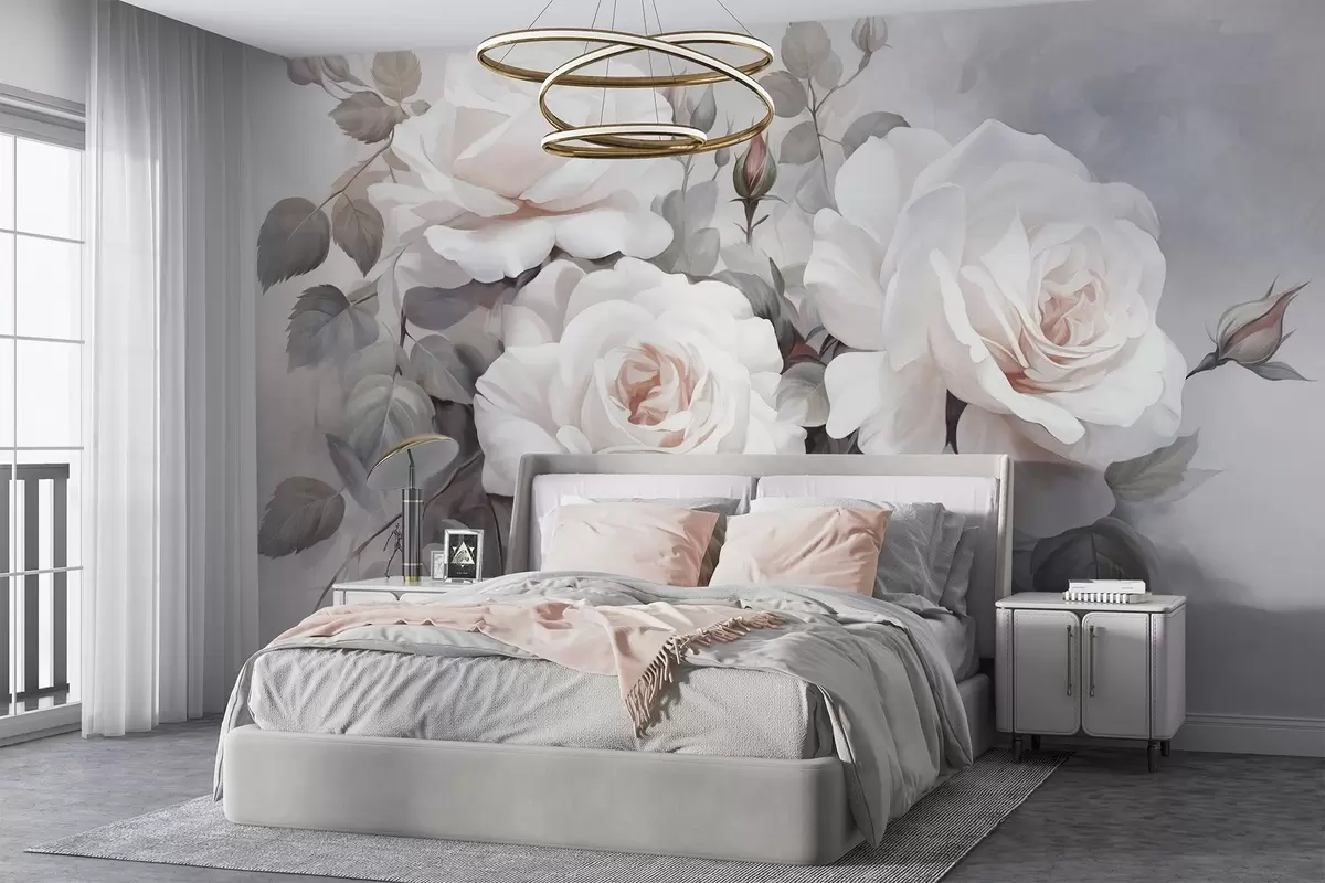 Τοιχογραφίες Υφή λευκά τριαντάφυλλα με φύλλα και μίσχους, απαλά υποτονικά παστέλ χρώματα, κομψό vintage στυλ , ντελικάτες πινελιές Nr. w09198