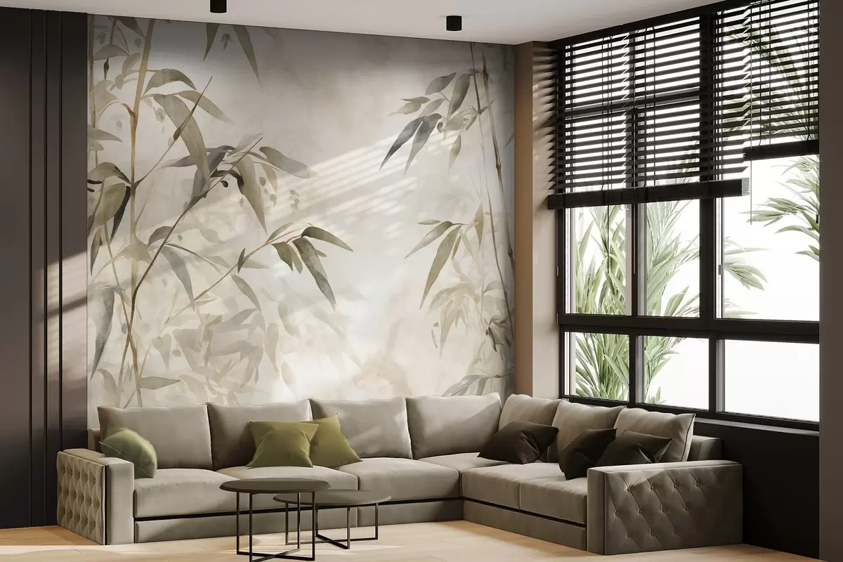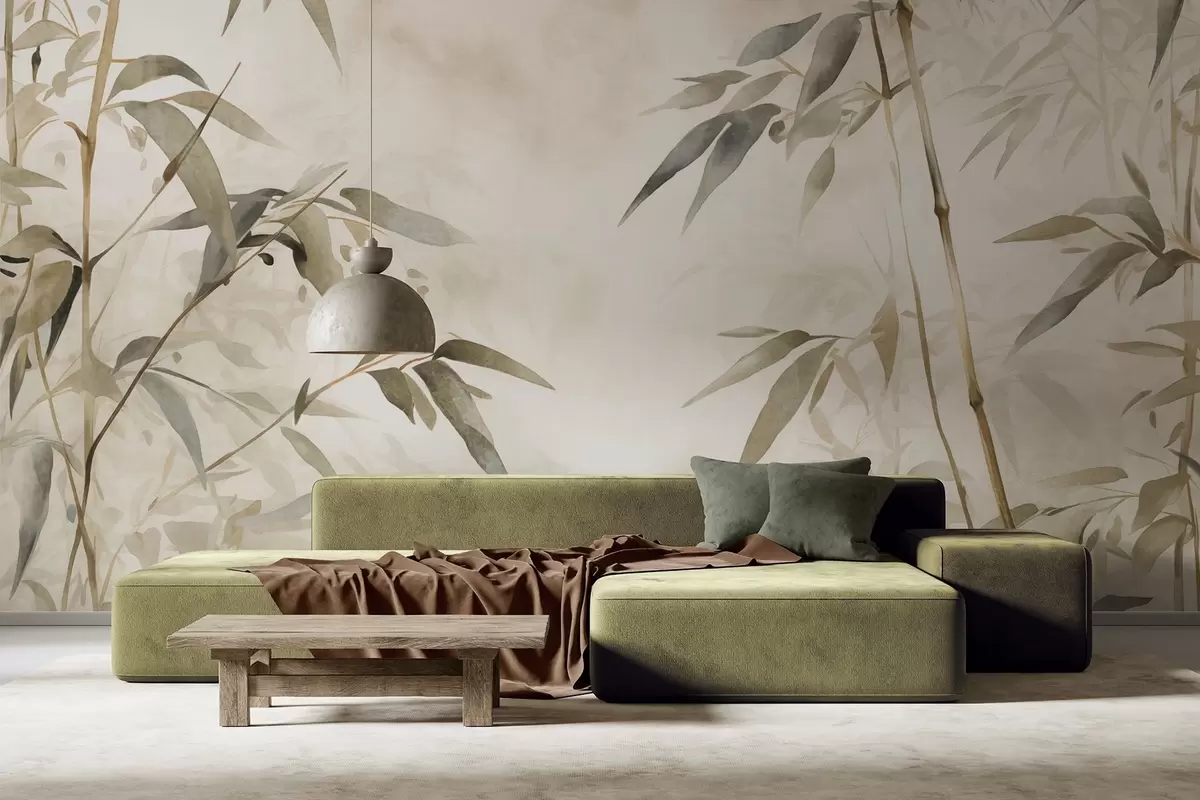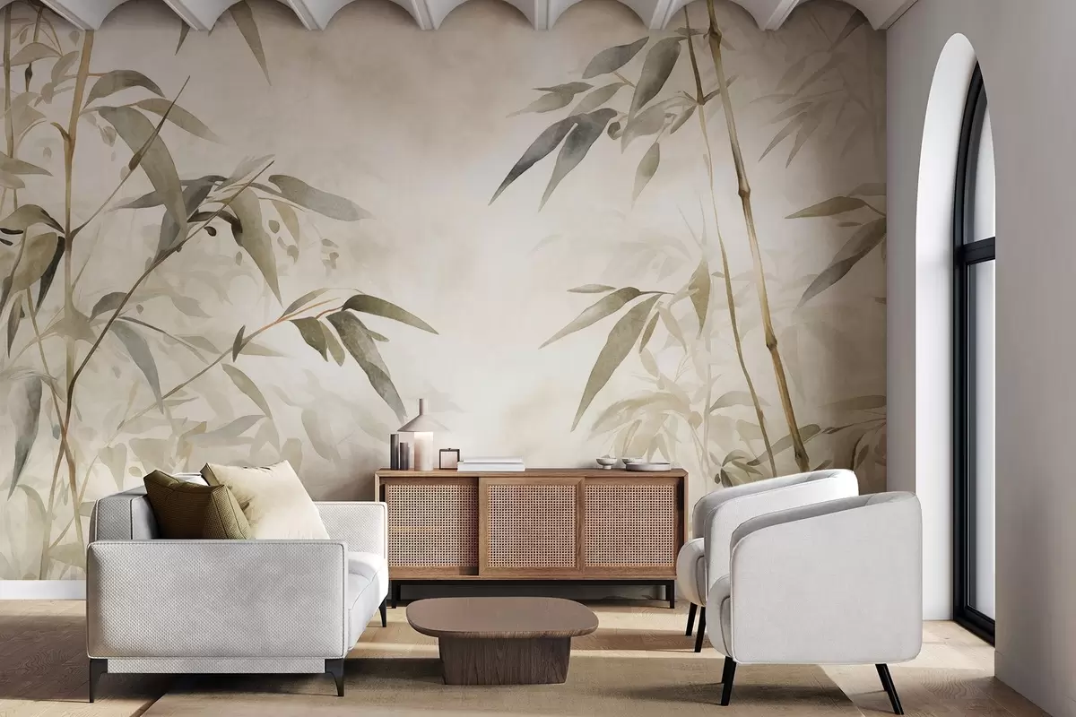 Τοιχογραφίες Κλαδιά μπαμπού με υφή και φύλλα σε στυλ ακουαρέλας, απαλή ουδέτερη παλέτα χρωμάτων, ανοιχτό μπεζ φόντο Nr. w09204