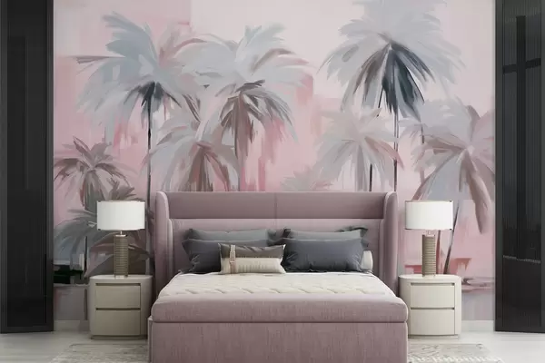 Τοιχογραφίες Αφηρημένα μινιμαλιστικά παστέλ τροπικά φοινικόδεντρα, σε φόντο με απαλές ροζ και γκρι αποχρώσεις Nr. w09212v1