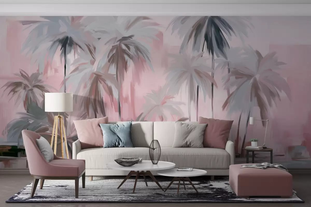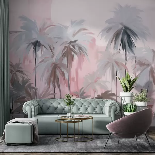 Τοιχογραφίες Αφηρημένα μινιμαλιστικά παστέλ τροπικά φοινικόδεντρα, σε φόντο με απαλές ροζ και γκρι αποχρώσεις Nr. w09212v1