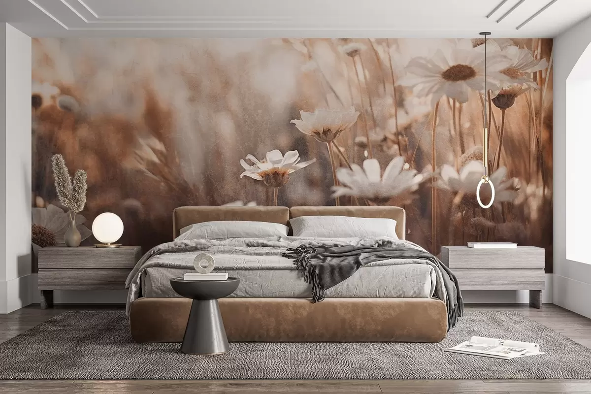 Τοιχογραφίες Πεδίο με υφή από λευκές μαργαρίτες και αγριολούλουδα σε ζεστή χρωματική παλέτα με θολό φόντο Nr. w09214