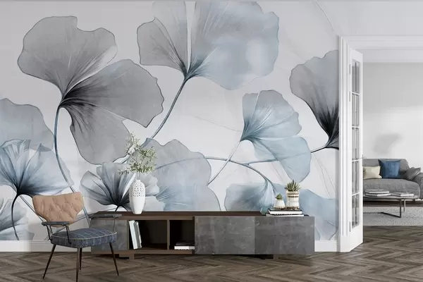 Τοιχογραφίες Φύλλα Ginkgo biloba σε υποτονικούς μπλε και γκρι τόνους, λεπτό εφέ υδατογραφίας με λεπτή υφή, ελαφρύ φόντο Nr. w09215v1