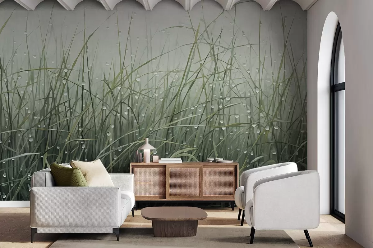 Τοιχογραφίες Γρασίδι με σταγόνες νερού, απαλές πράσινες αποχρώσεις, απαλό φως, ομιχλώδες φόντο, αφηρημένο μινιμαλιστικό στυλ με υφή Nr. w09217