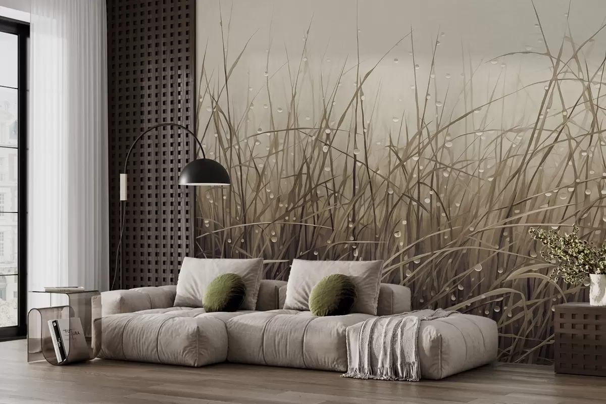 Τοιχογραφίες Γρασίδι με σταγόνες νερού, σιωπηλές καφέ αποχρώσεις, απαλό φως, ομιχλώδες φόντο, αφηρημένο μινιμαλιστικό στυλ με υφή Nr. w09217v1