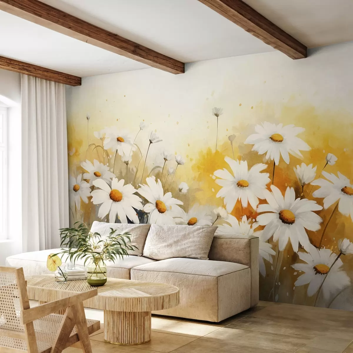 Τοιχογραφίες Ένα πεδίο από λευκές μαργαρίτες με κίτρινα κέντρα, σε απαλό κίτρινο και μπεζ φόντο, σε στυλ ακουαρέλας Nr. w09218