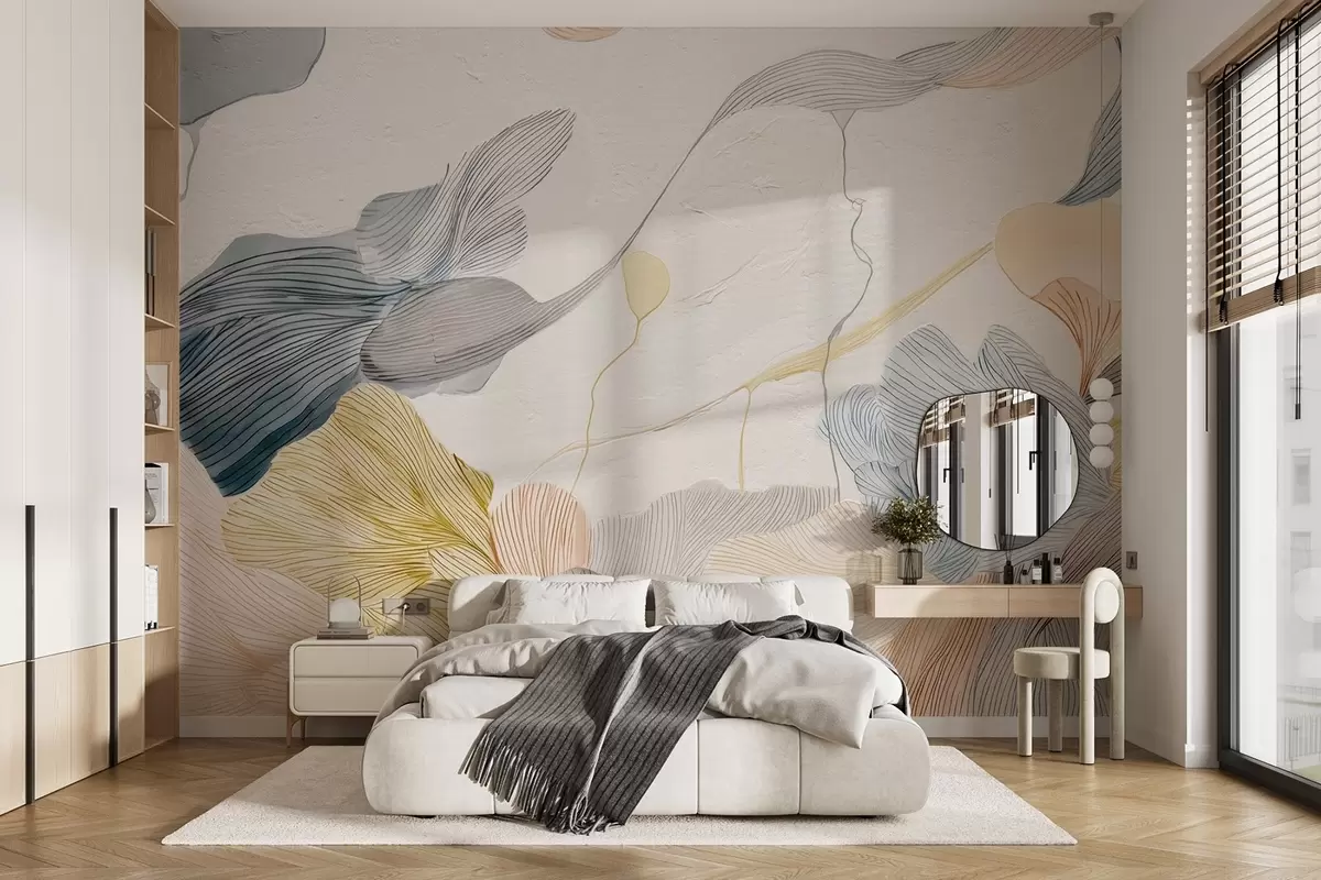 Τοιχογραφίες Αφηρημένα γραφικά φύλλα σε ζεστούς και ψυχρούς παστέλ τόνους Nr. w09222v1