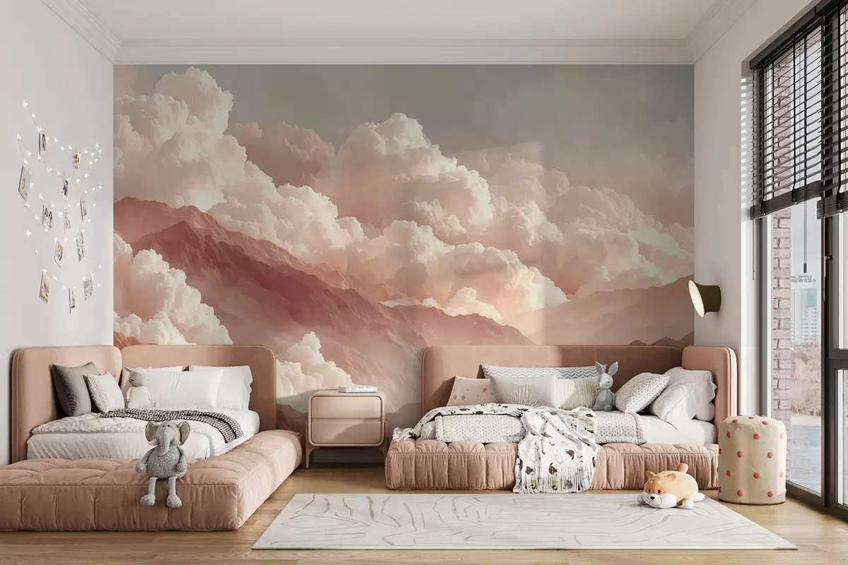 Τοιχογραφίες Ζεστή ανατολή πάνω από βουνά με χνουδωτά σύννεφα Nr. w09226