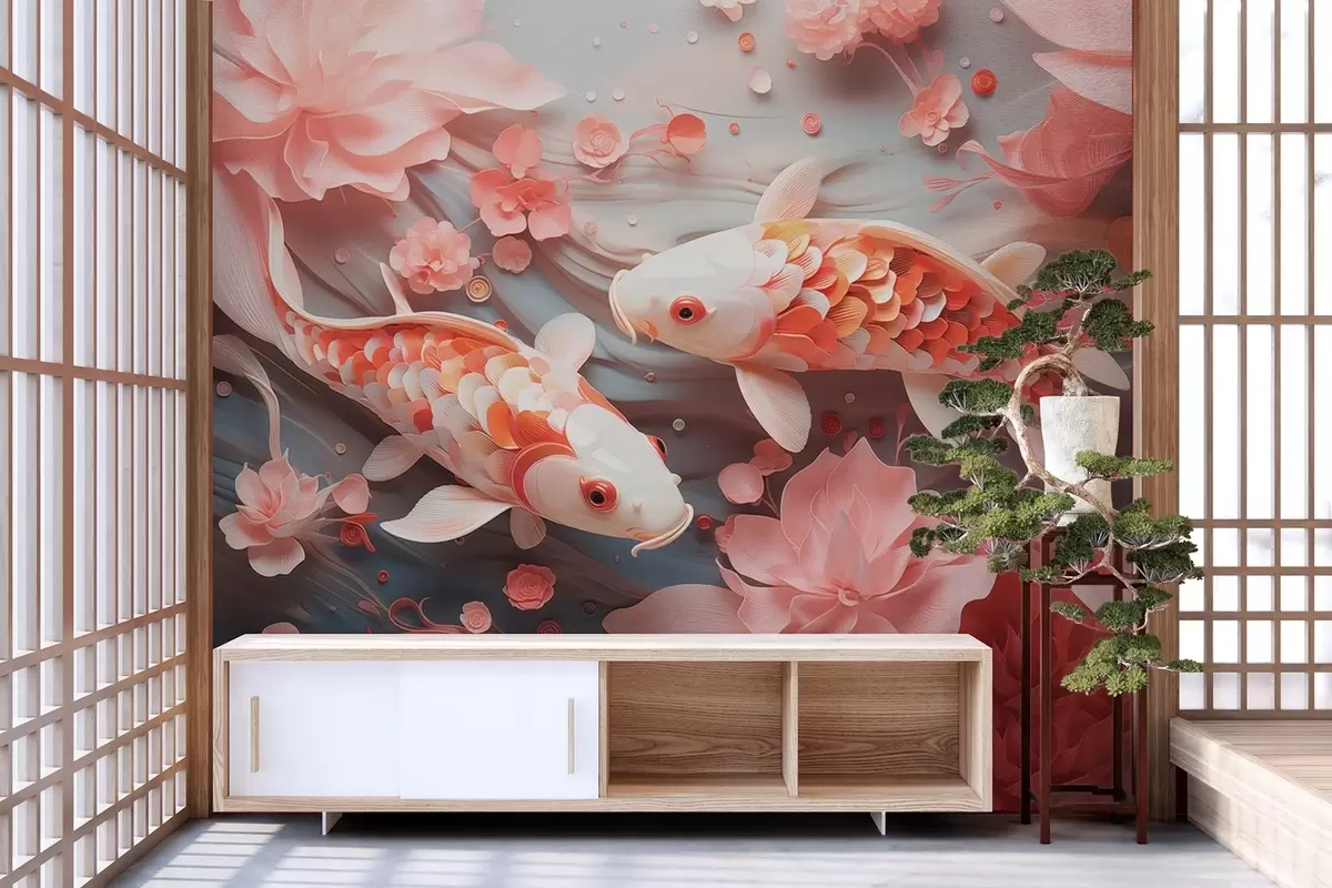 Τοιχογραφίες Λεπτά ψάρια με διαστατικές κλίμακες κολυμπούν μέσα σε μια ροή από πέταλα και απαλές ροζ αποχρώσεις Nr. w09237