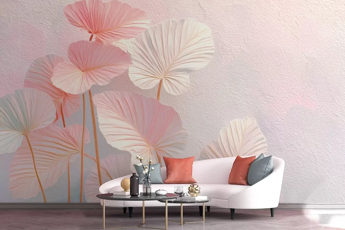 Τοιχογραφίες Κομψά μεγάλα τροπικά φύλλα σε απαλές ροζ και μπλε αποχρώσεις Nr. w09252