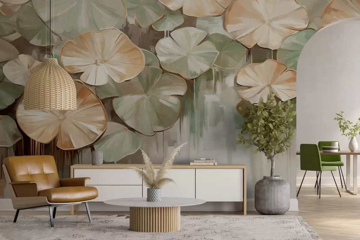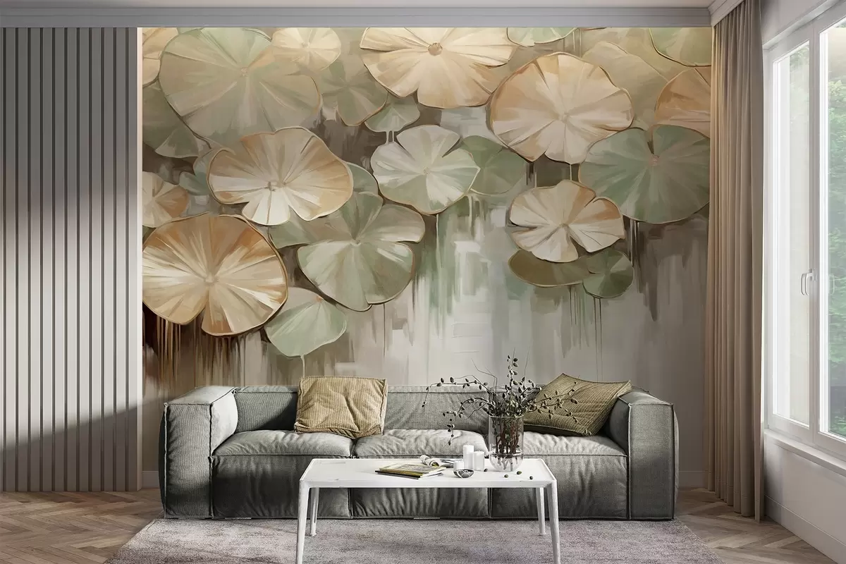 Τοιχογραφίες Υφασμάτινα κρινάκια με πράσινα και μπεζ χρώματα σε μια λίμνη, το φόντο είναι ένα θολό μείγμα λευκού, πράσινου και καφέ Nr. w09255