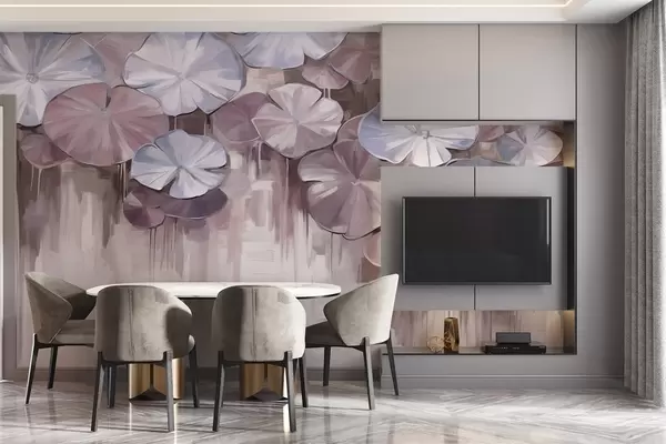 τοιχογραφίες Υφασμάτινα μαξιλαράκια κρίνων με βιολετί και μπλε χρώματα σε μια λίμνη, το φόντο είναι ένα θολό μείγμα απαλών αποχρώσεων του μωβ w09255v1