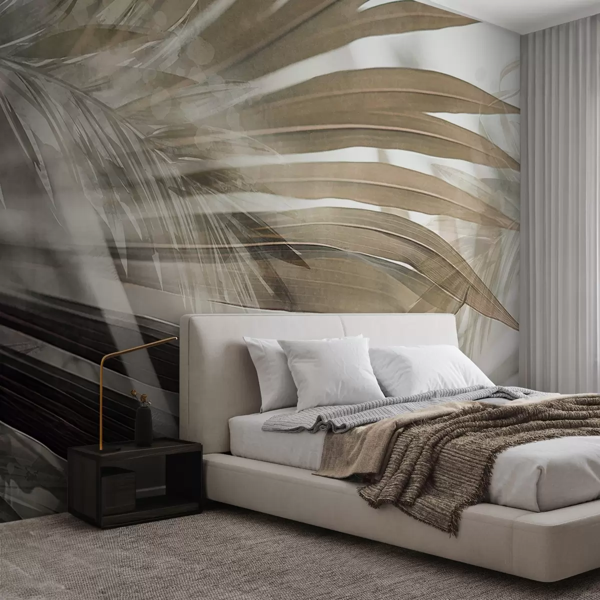 Τοιχογραφίες Φύλλα φοίνικα με ανοιχτή καφέ απόχρωση, που επικαλύπτονται και δημιουργούν ένα πολυεπίπεδο εφέ, σε ένα απαλό, ουδέτερο φόντο Nr. w09256