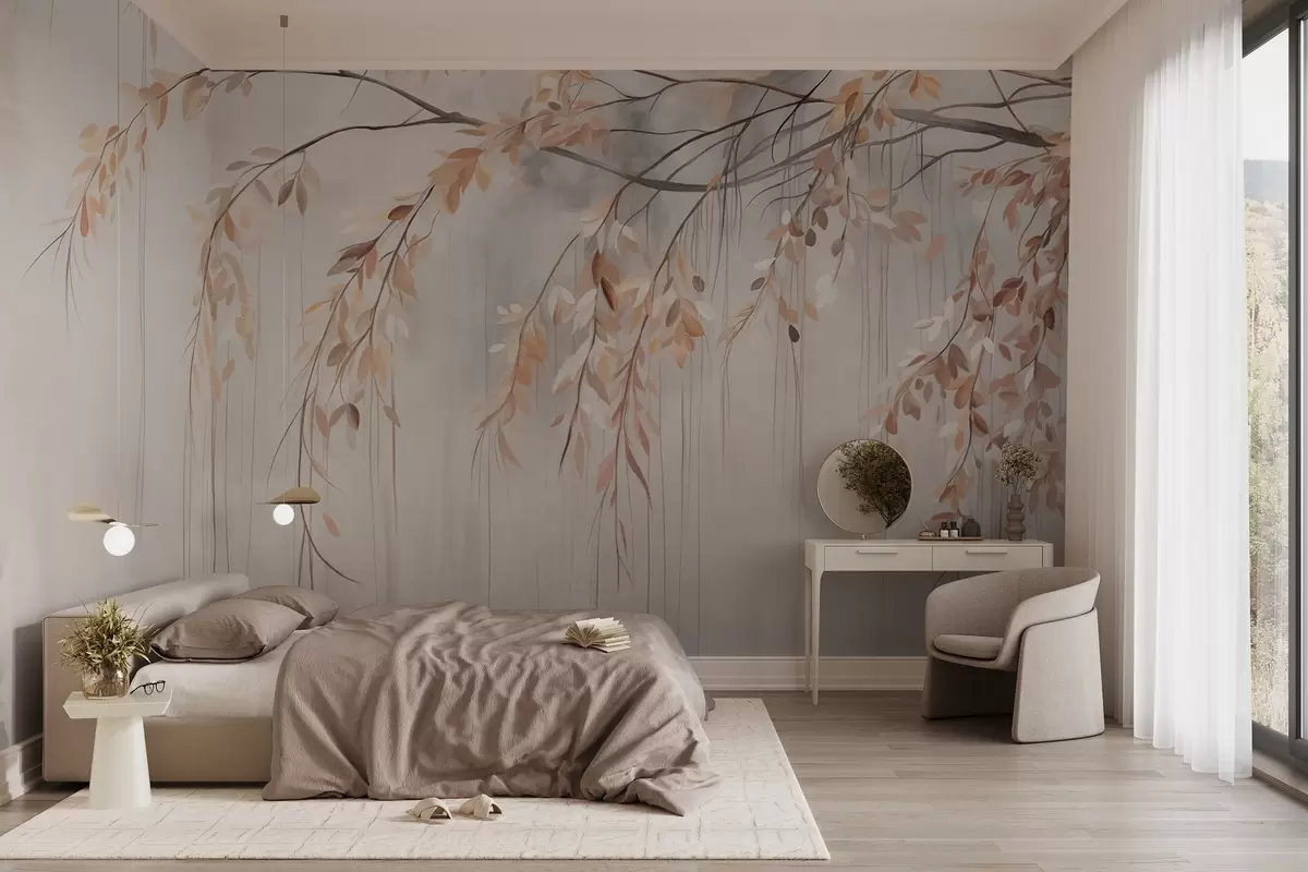 Τοιχογραφίες Ένα κλαδί με ανοιχτό πορτοκαλί φύλλα που κρέμονται κάτω, ανοιχτό γκρι υφή θολή φόντο, μαλακό και λεπτό στυλ Nr. w09265