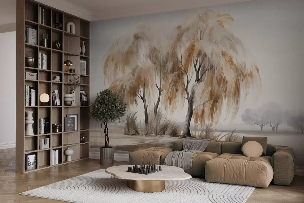 Τοιχογραφίες Δέντρα ιτιάς με καφέ και λευκά φύλλα στην όχθη μιας λίμνης, με λίγο γρασίδι γύρω τους, σε μια ομιχλώδη μέρα Nr. w09268