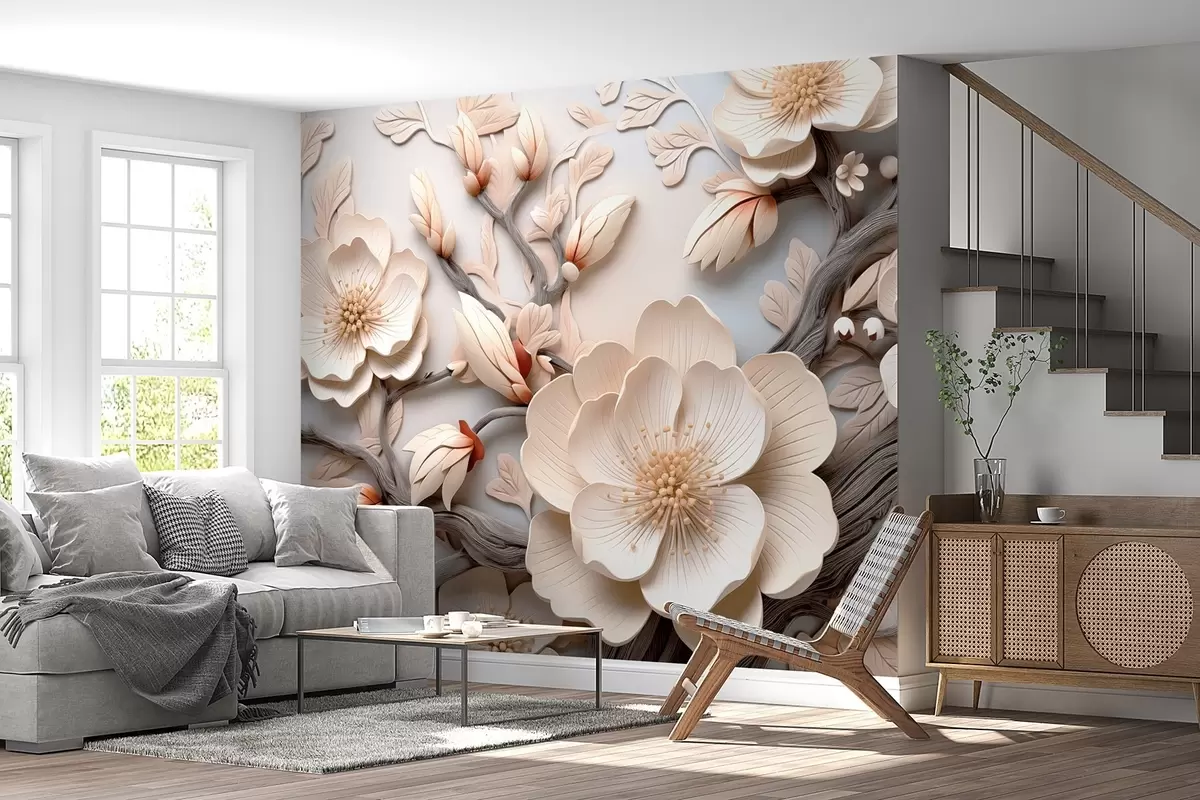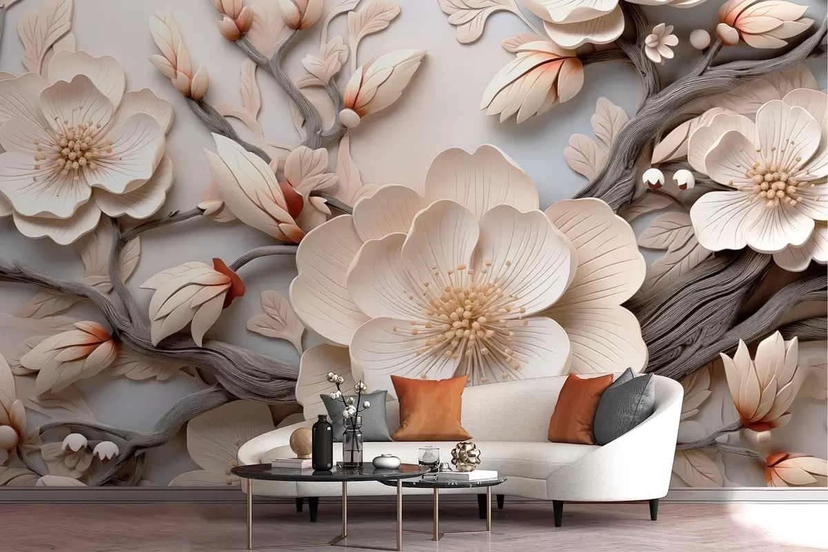 Τοιχογραφίες Ογκομετρικά λουλούδια και κλαδιά σε ανοιχτούς τόνους Nr. w09272