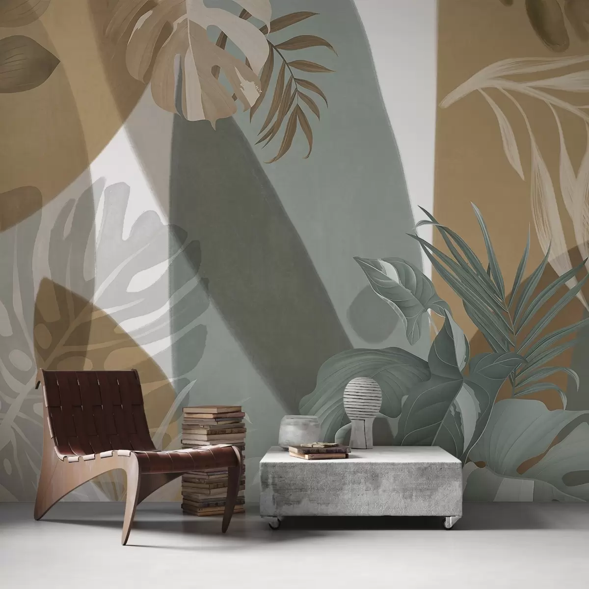Τοιχογραφίες Φύλλα Monstera και φύλλα φοίνικα σε μοτίβο με καφέ, λευκό και πράσινο χρώμα, τροπική ατμόσφαιρα, αφηρημένα σχήματα, διακοσμητικά Nr. w09288